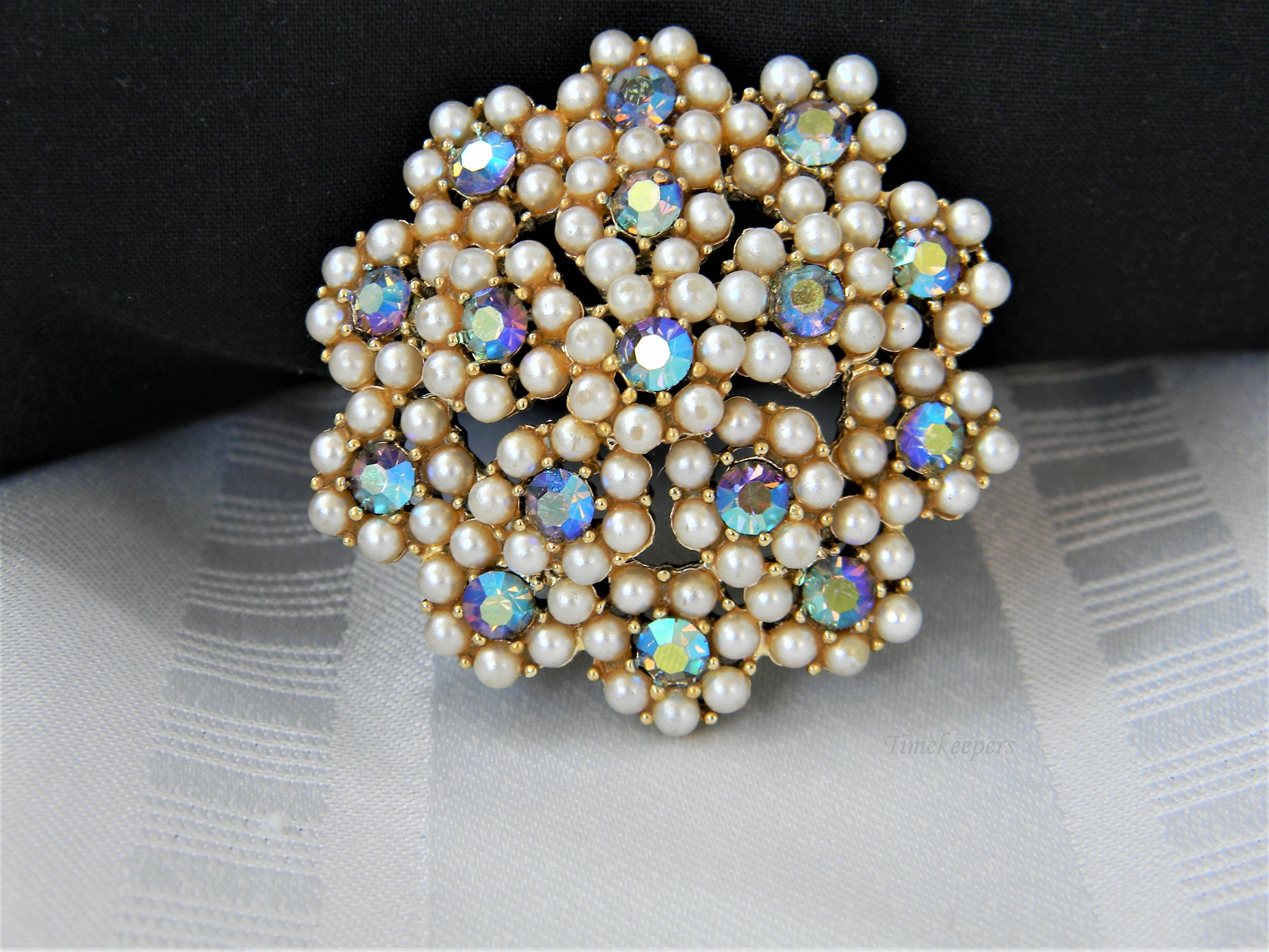 j220 Stunning Vintage Brooch with Simulated Pearls and Sparkling Blue Stones