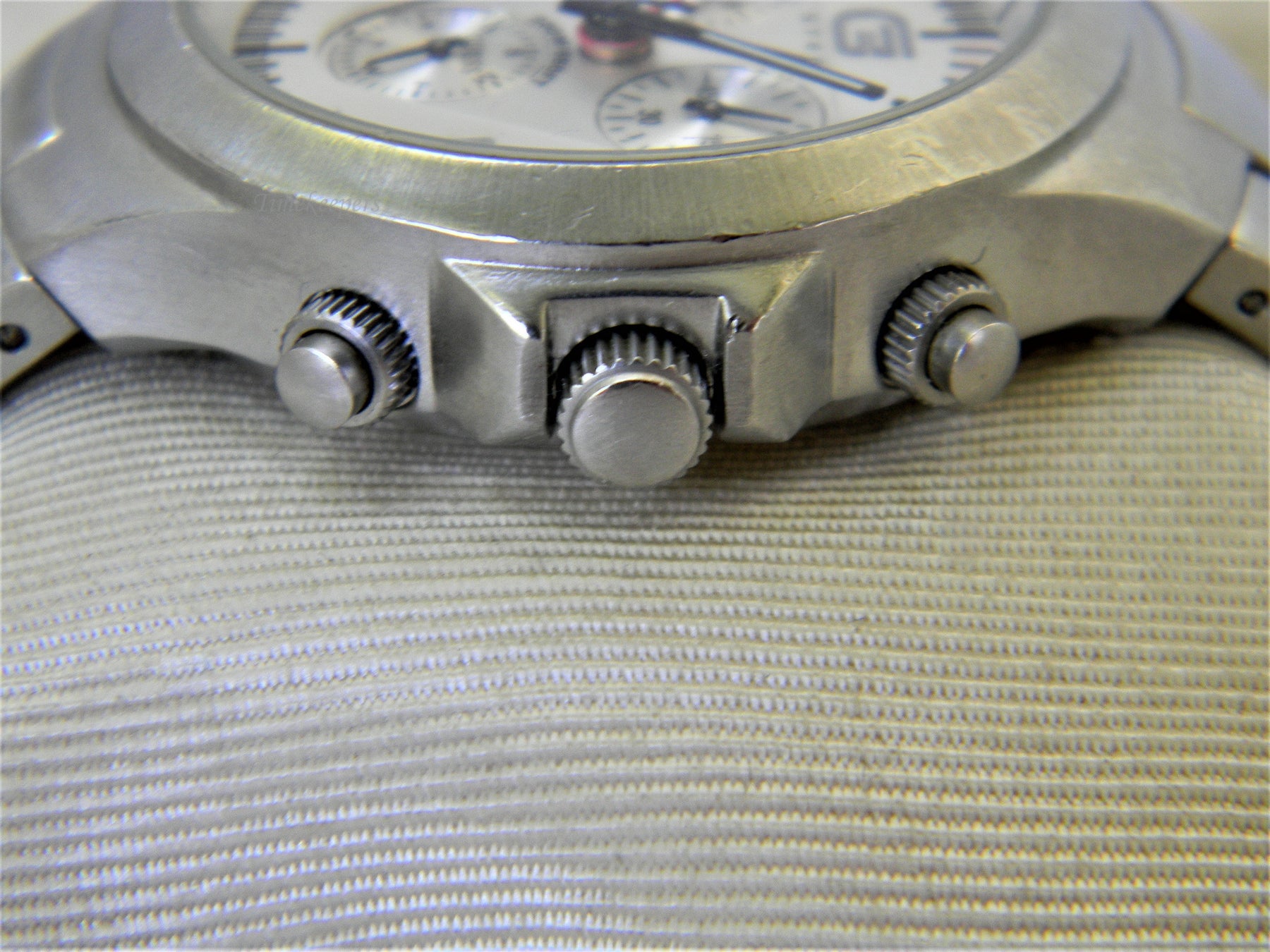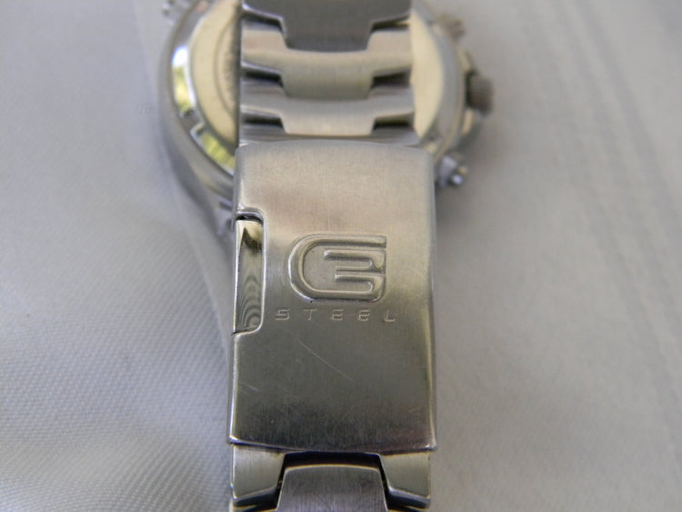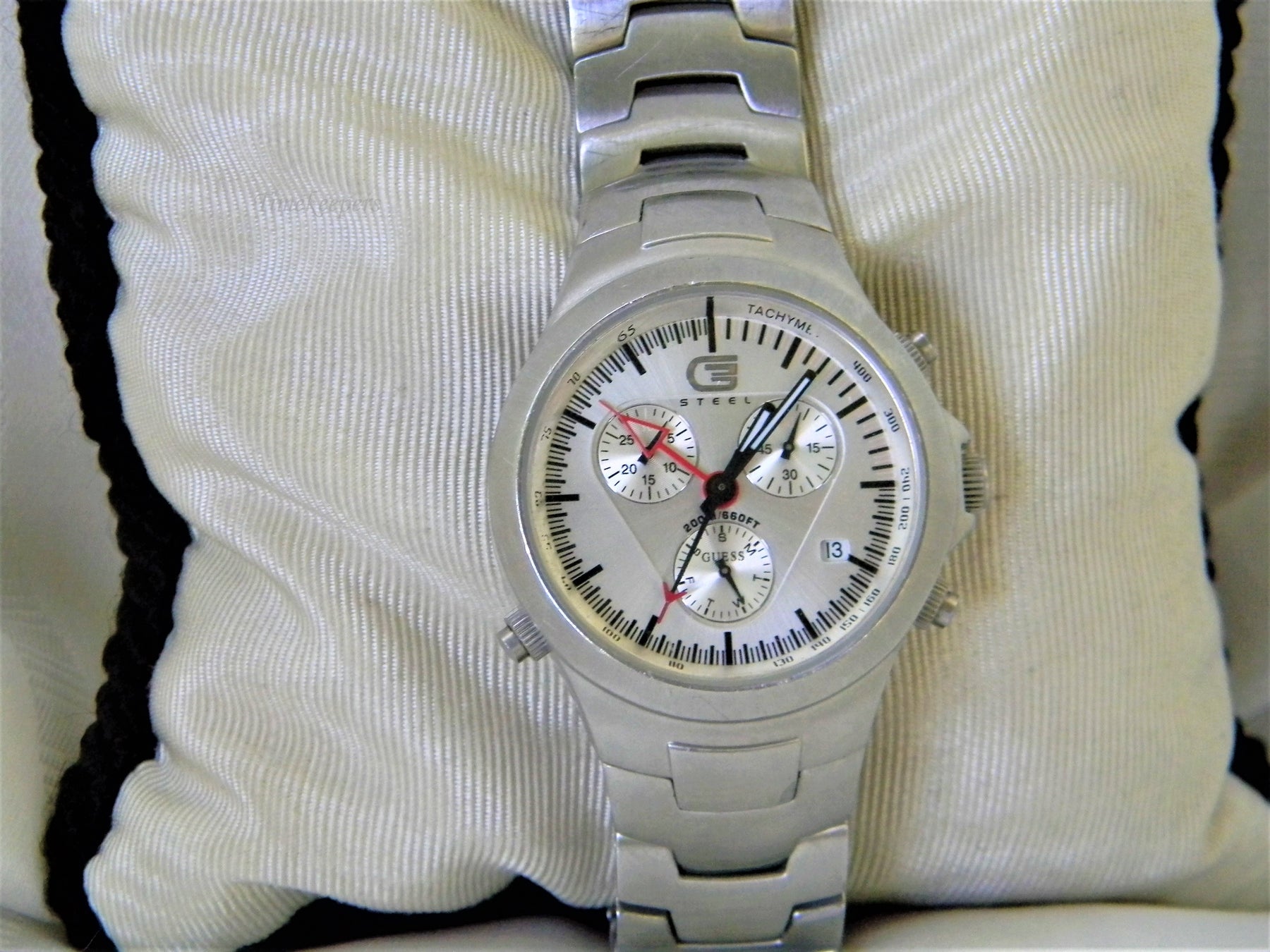 Retro Guess Inc. G Quartz Chronograph Wrist Watch in Stainless Steel Pre-owned: Some scratches from normal wear, appropriate to its age. Please see photos for details. Watch is working and keeping time well. Watch is in great mechanical condition, all of our watches are tested for time by one of our watchmakers before being listed for sale. Specifics: