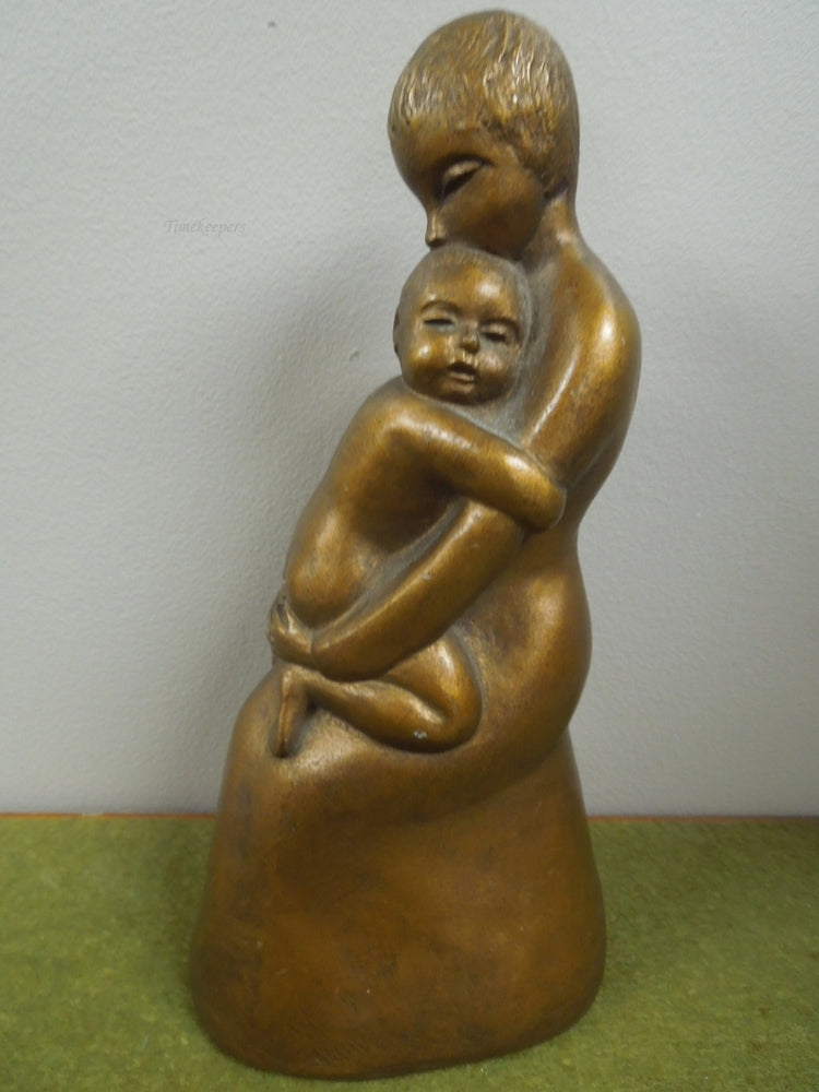 The original sculpture titled "Together" was done by Helga Meyer, a sculptor who had an exhibit in 1969 at the Nicholas Roerich Museum in New York City entitled "Sculpture by Helga Meyer." She also had her sculpture "Freedom Fighter" featured on the February 1970 cover of The Crisis Magazine of the NAACP. Her "Together" statue is a touching tribute to motherhood with a mother and her child clasped in a loving embrace. This is a copy of that sculpture made by Alva Museum Replicas and has a nice 'bronze' powdered metal paint finish which has the low luster of a bronze statue. Alva Studios made these exacting replicas in Alvastone and called them "Alvacasts. Impressed at the bottom of the back of the statue is the copyright mark, the date 1970 and Helga Meyer.