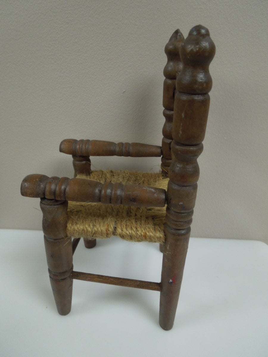 Cute mini chair made of wood, with a woven seat made of straw/rush fiber.