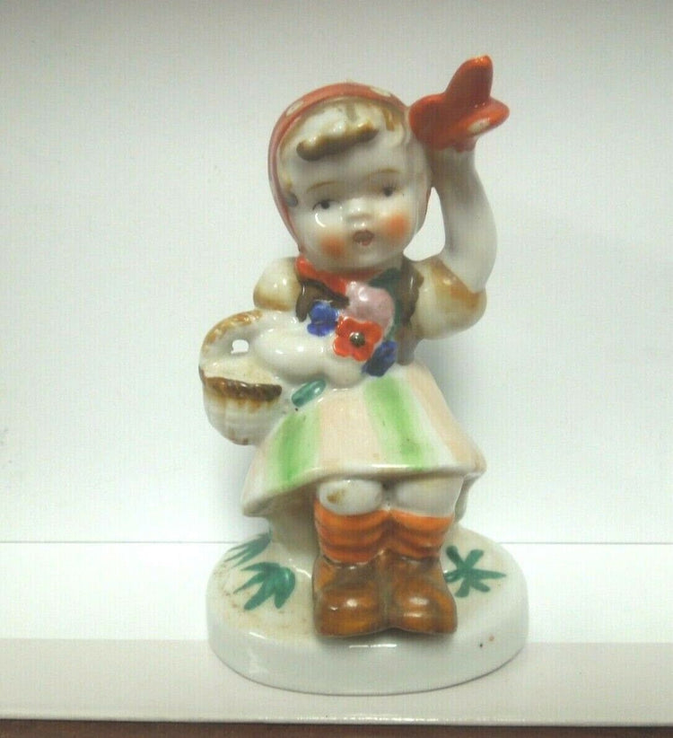 r099 Occupied Japan ceramic figurine, little girl sitting on mushroom scarf & basket