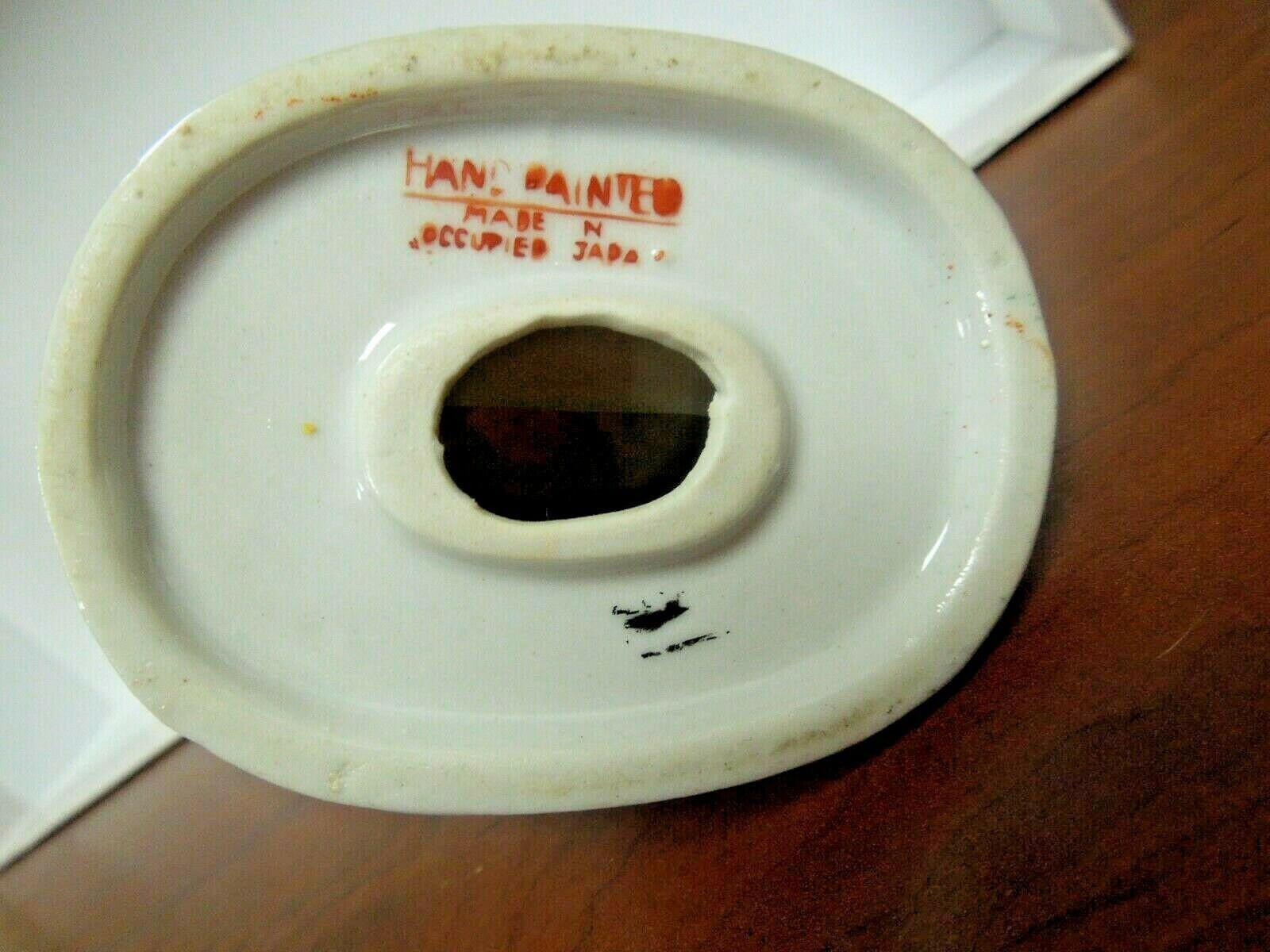 Occupied Japan ceramic figurine, little girl sitting on mushroom red scarf with white polka dots and basket. Condition is "Used". There are no chips, cracks or repairs. Cute little girl with rosy cheeks and red lips. Bottom reads, "Made in Occupied Japan". Shipped with USPS