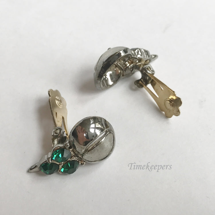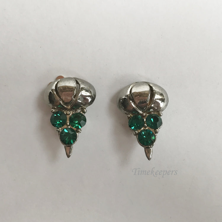 - Vintage pair of clip on earrings. Silver tone. 3 large green stones 5mm in diameter.