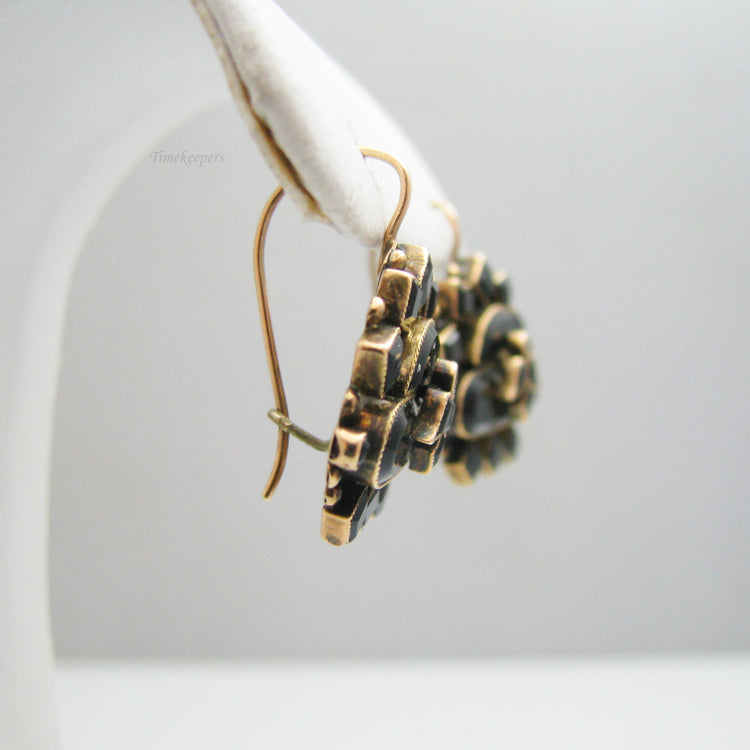 These earrings are decorated with Onyx stones, and molded out of gold. They are not stamped, but have been tested for authenticity.