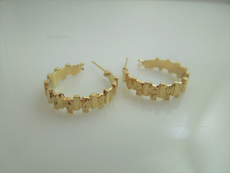 These are a pretty pair of 14kt yellow gold hoop earrings. They feature smooth and bark style rectangle slats alternating together. Perfect for daily wear. Would be a nice anniversary, birthday, Christmas, Mother's Day or Valentine's Day gift for her.