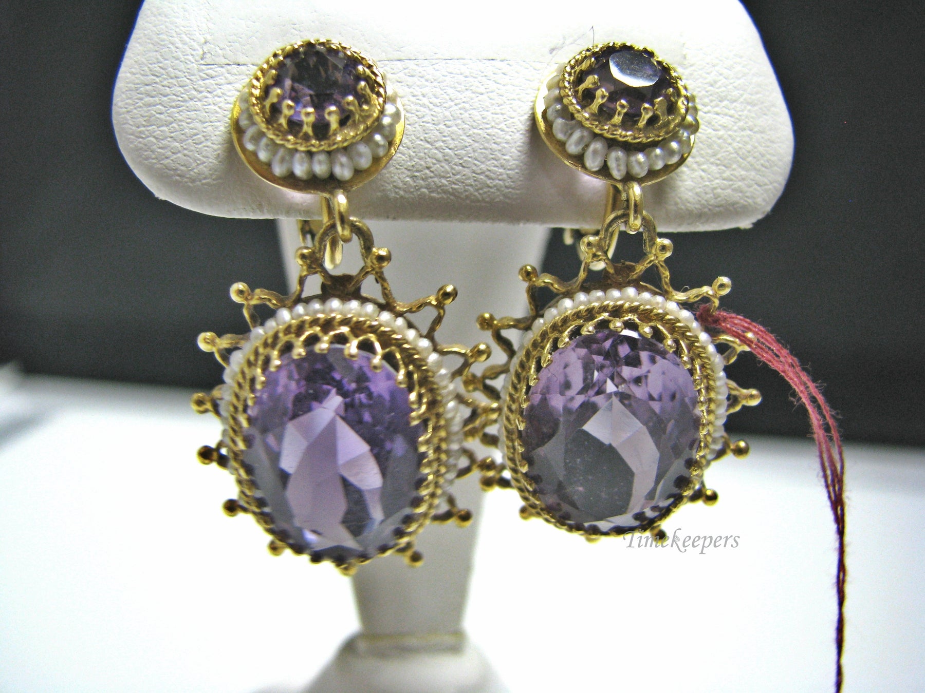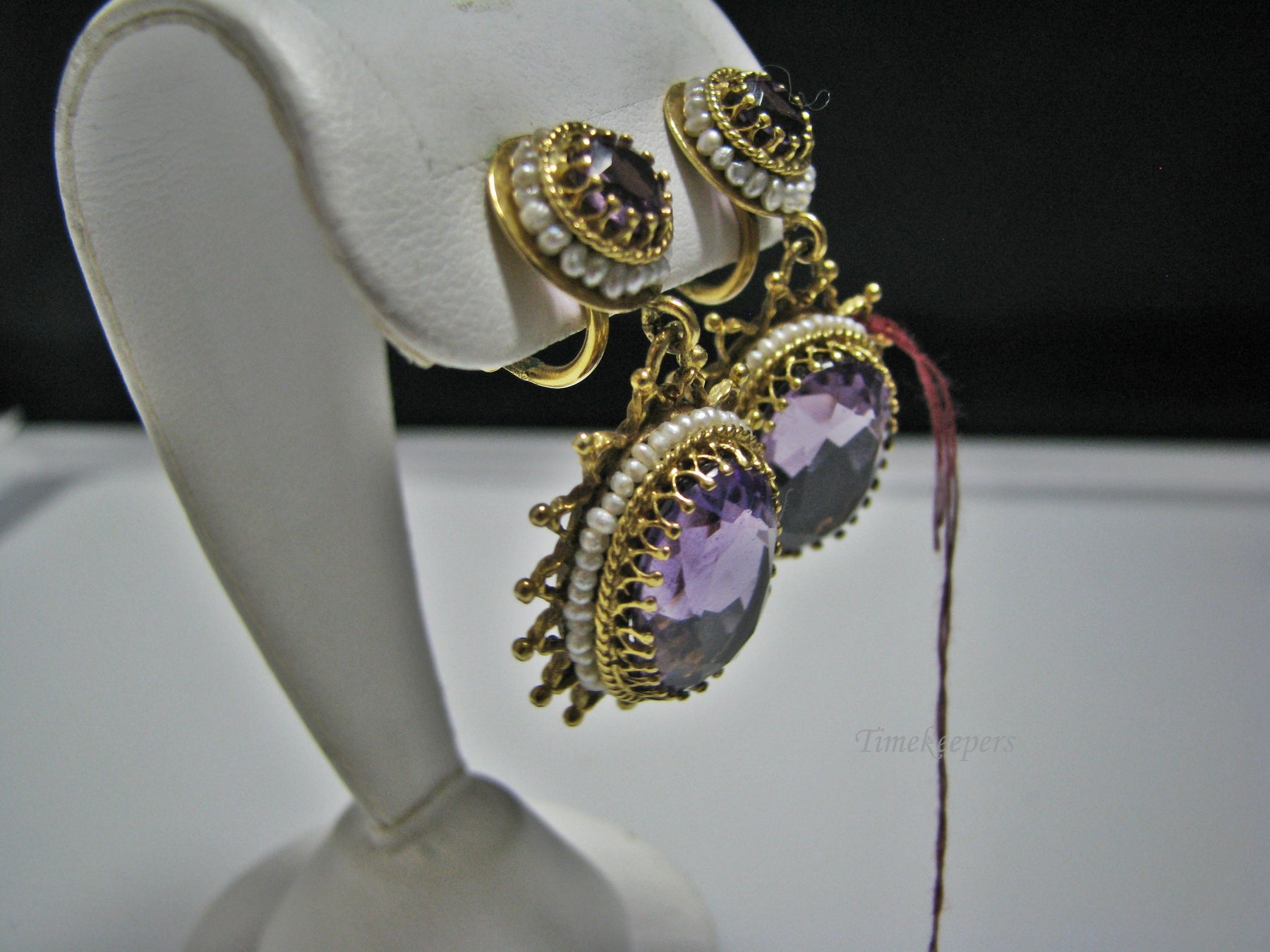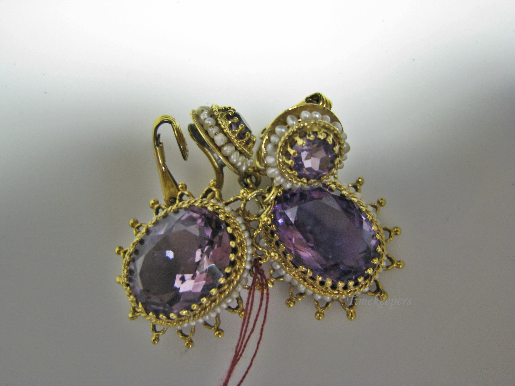 For Sale: (1)H070 Stunning Amethyst Earrings with Sea Pearls in 14k Yellow Gold