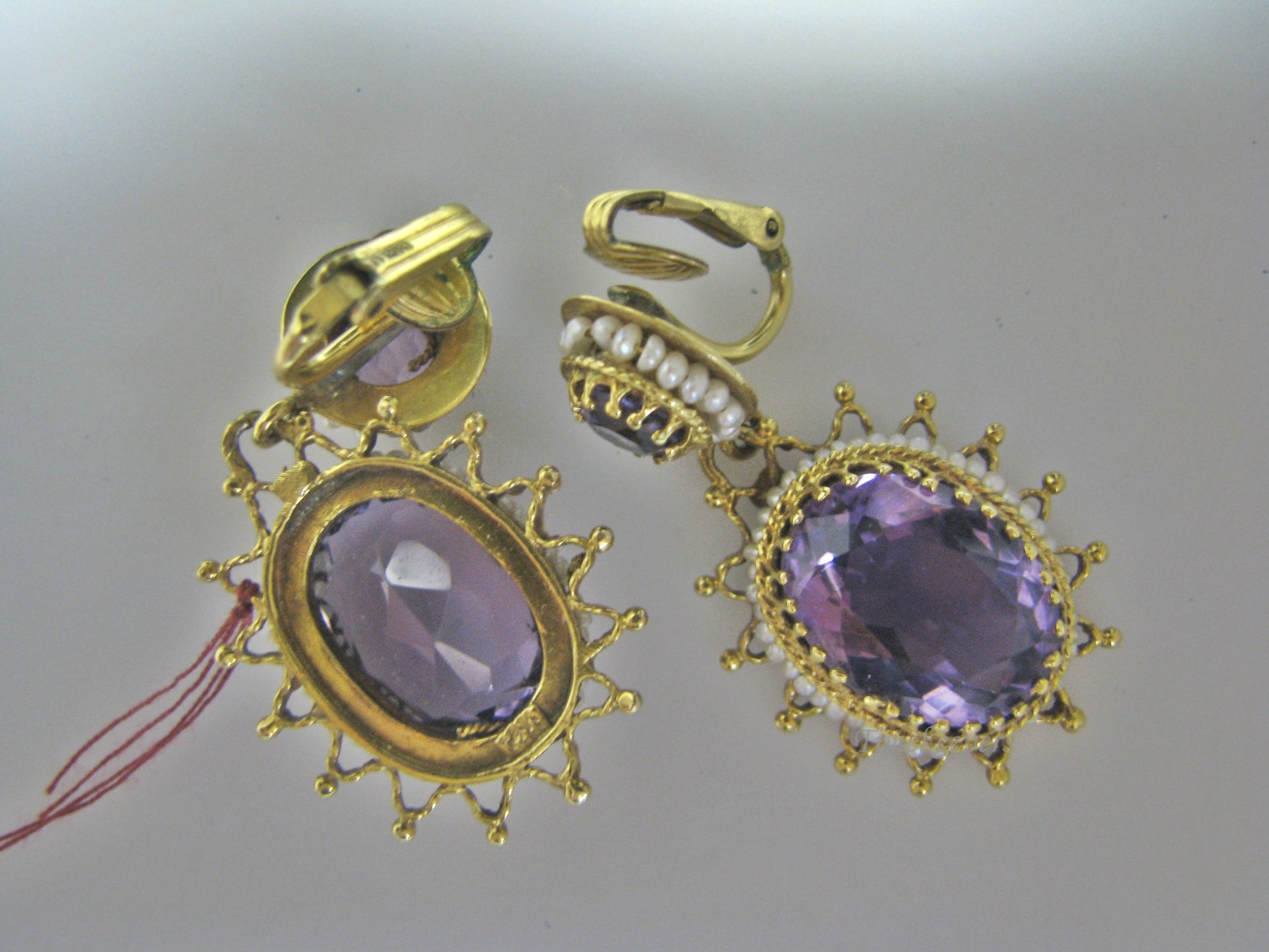 A beautiful Amethyst earrings with sea pearls in 14k yellow gold. A beautiful Amethyst stone is surrounded by lovely sea pearls. The Amethyst is set in a fine gold twist design mounting on French wires for a drop style. Earring have clip on backs. It is stamped 14k. These earrings are stunning and are perfect for any special occasion!
