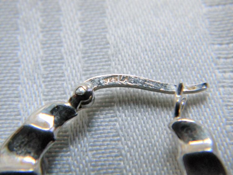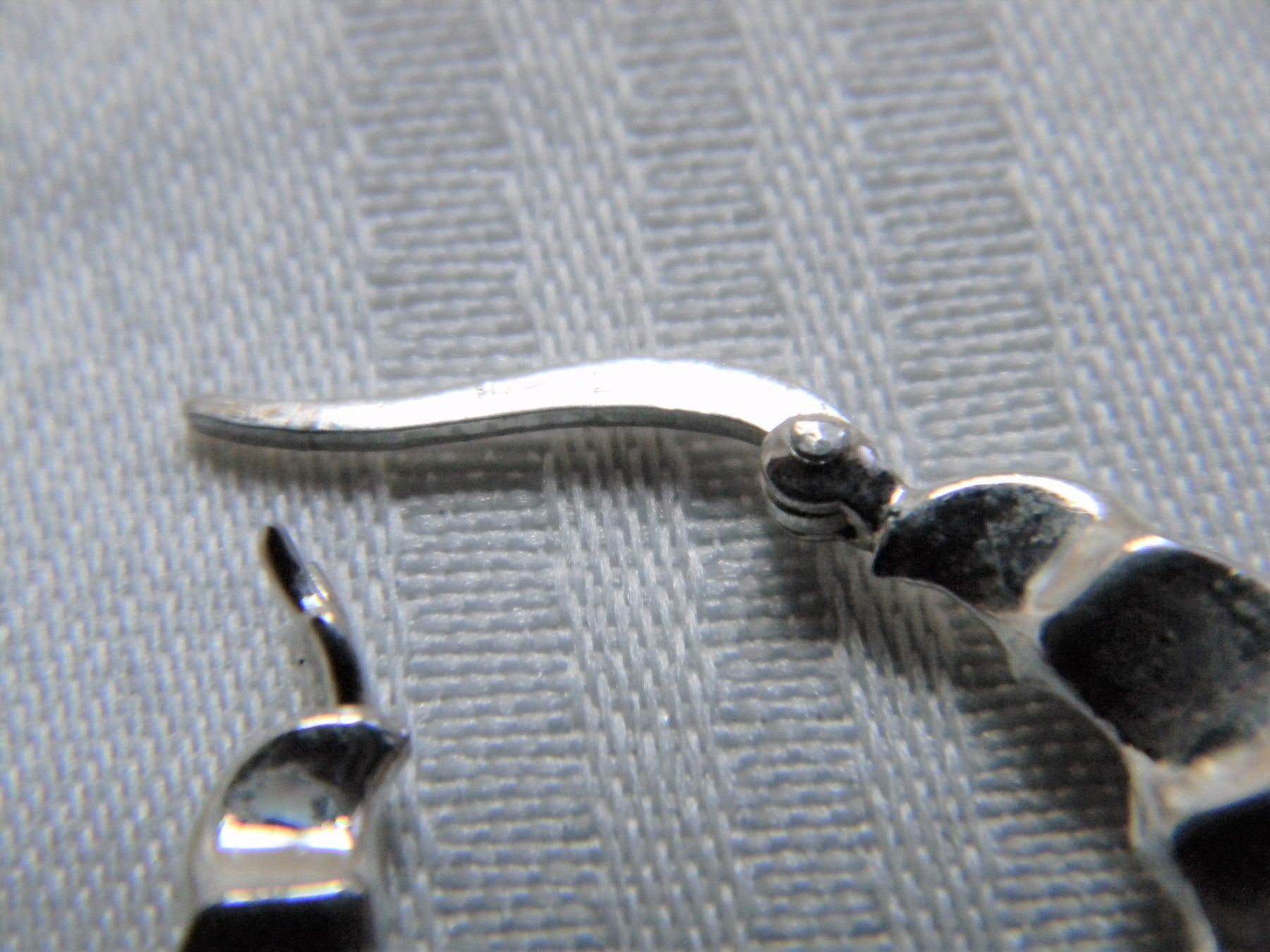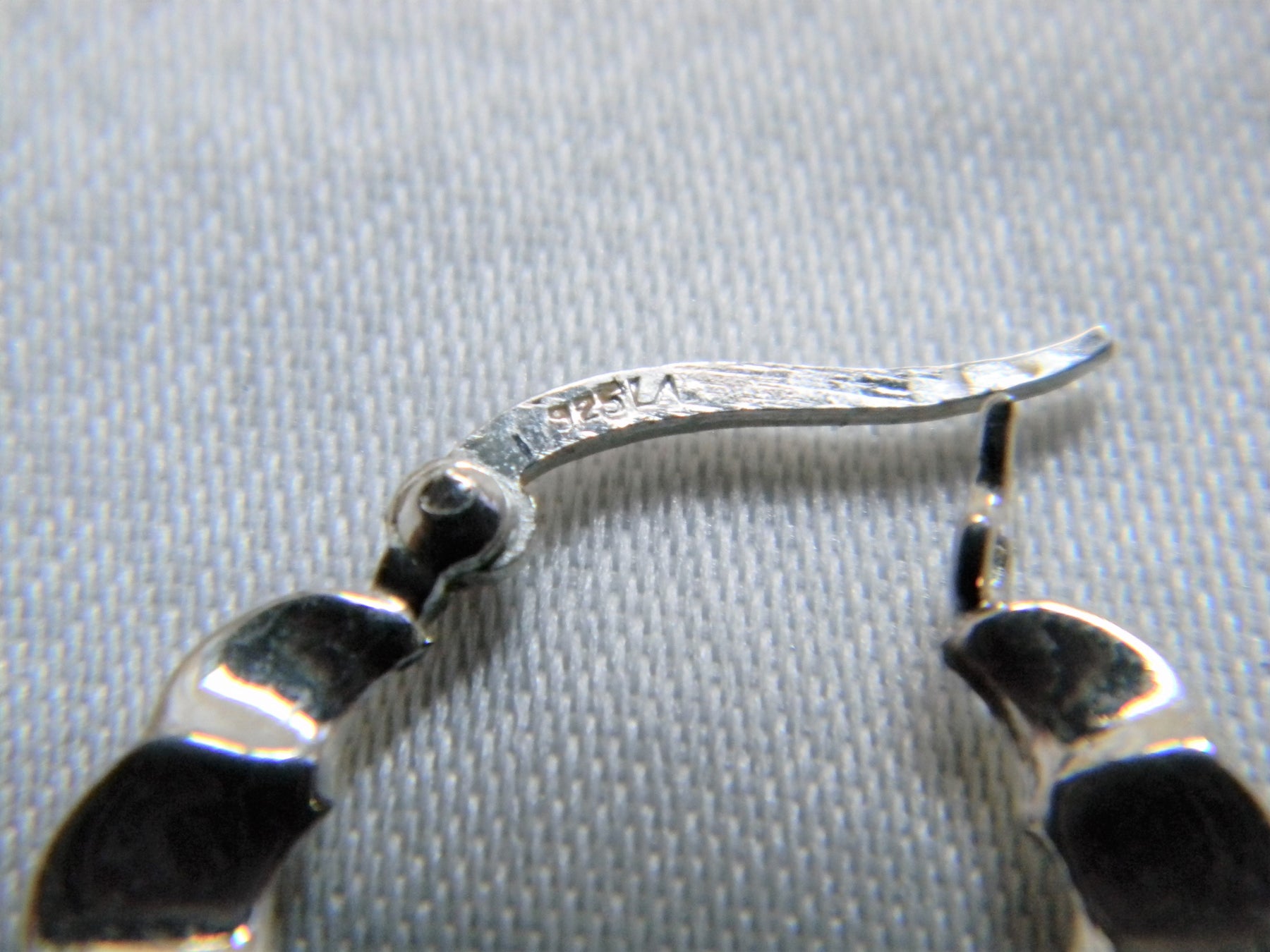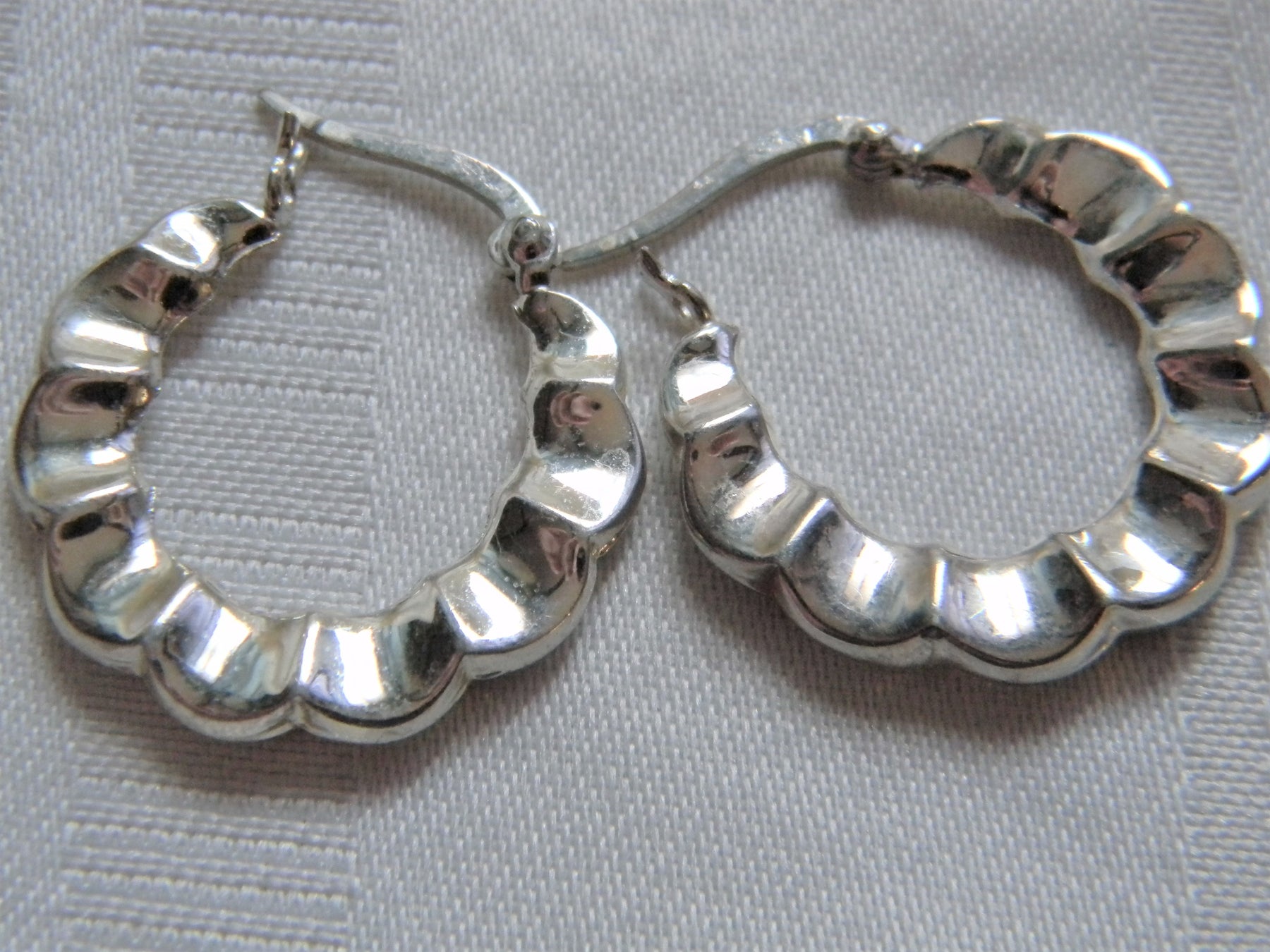 These earrings are lovely hoop earrings with lever closures. The earrings are marked 925. There are small scratches as shown in pictures.