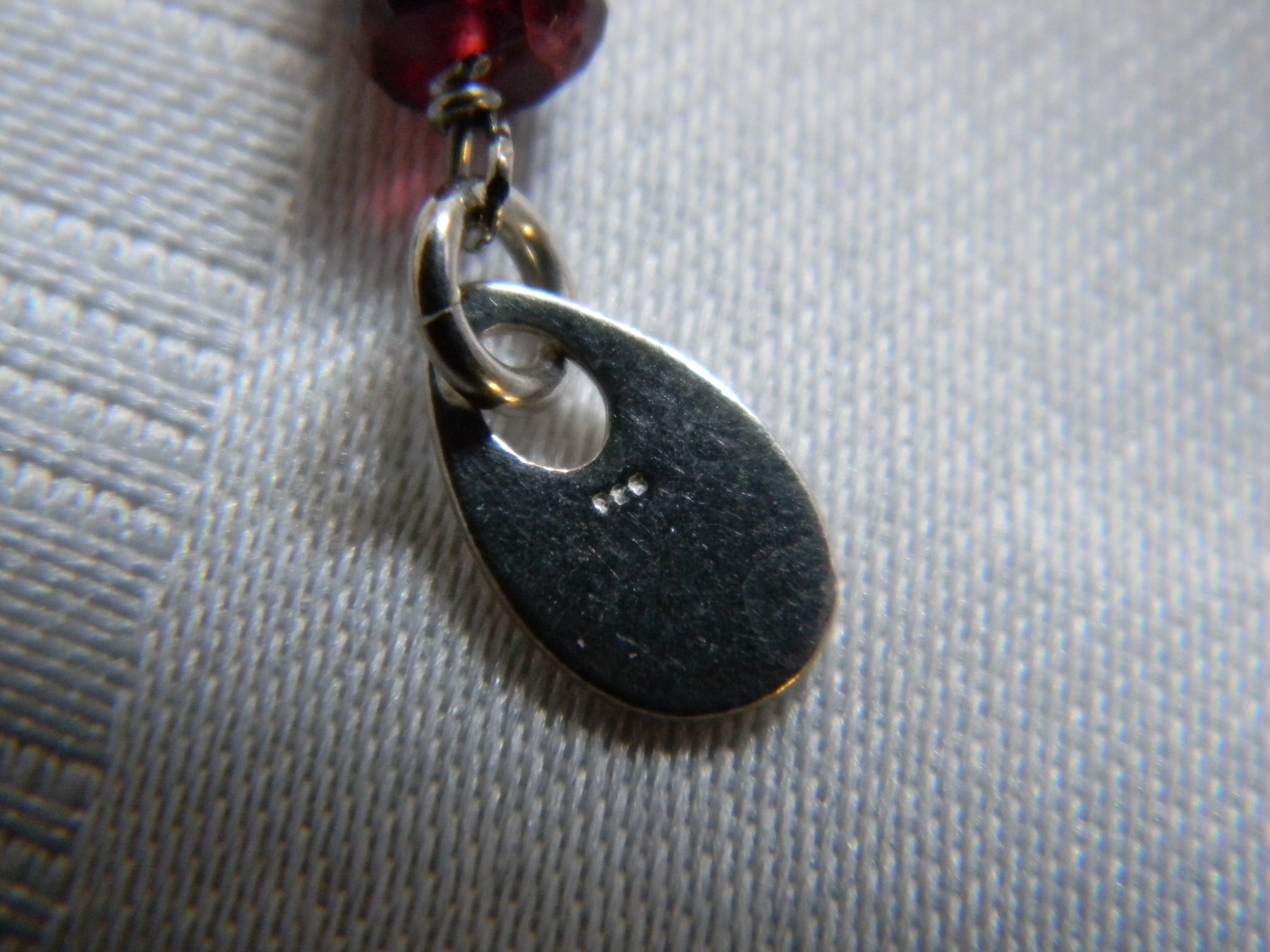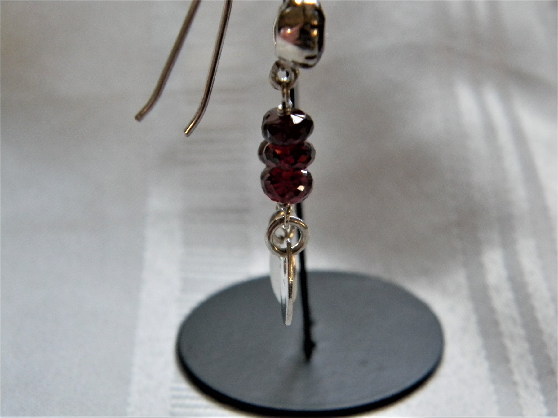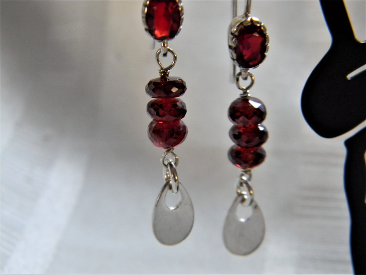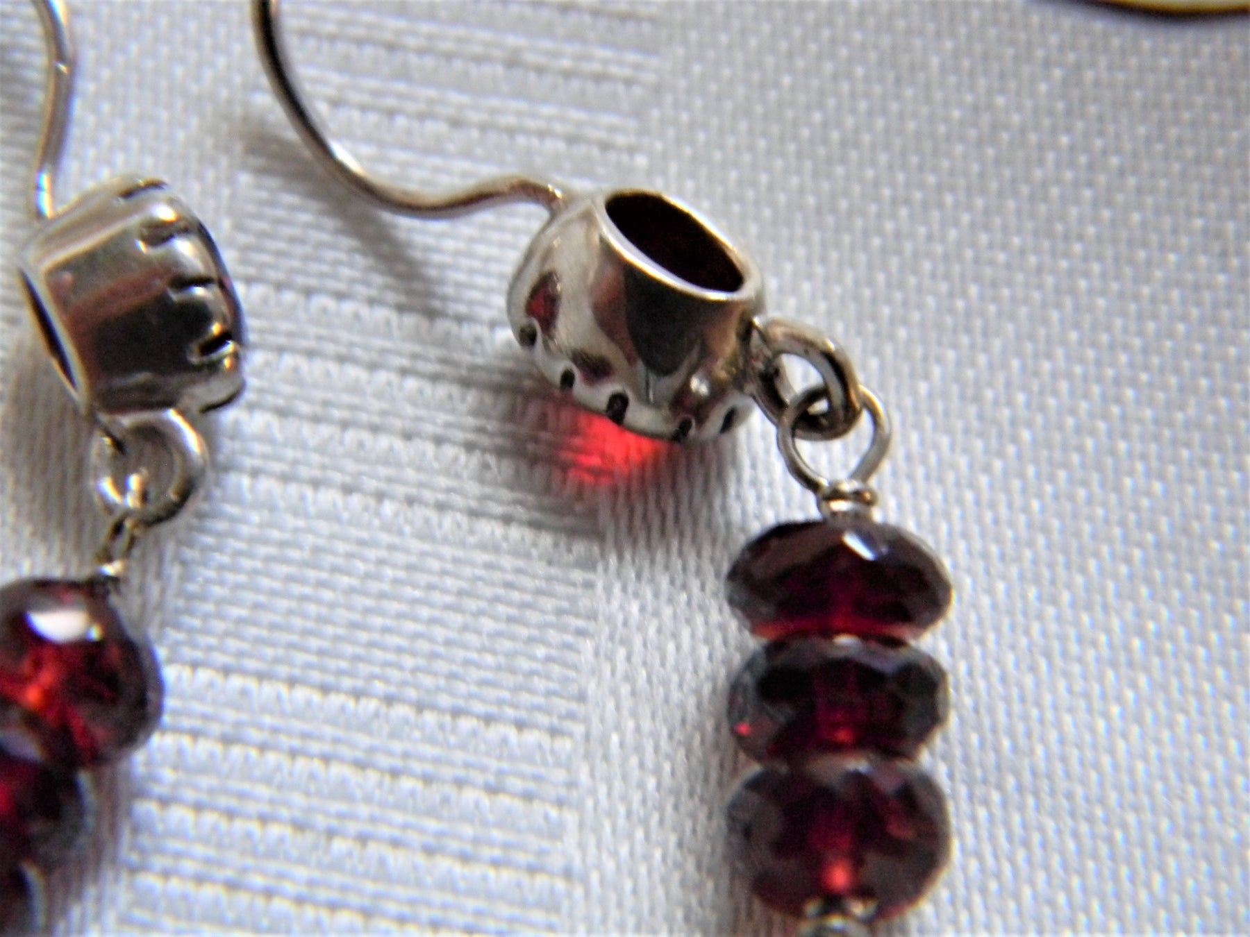 These lovely earrings feature a red set faceted stone on a french hook with a dangle of (3) faceted red stones and a sterling tear drop at the end. The back of the dangles are marked 925.