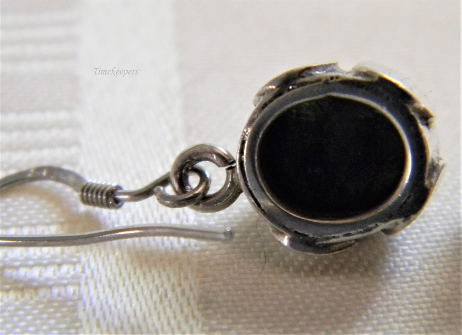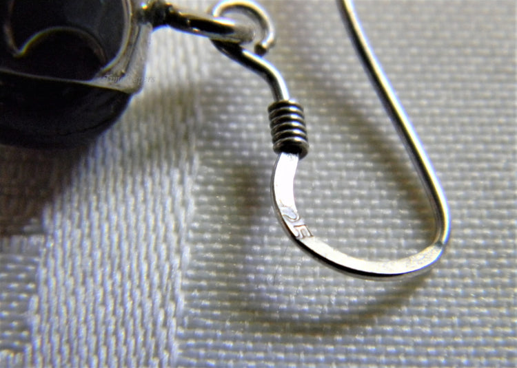 These lovely dangle earrings feature an oval very dark green stone bezel set in sterling silver with quarter moons around the setting. The ear wires are marked 925.