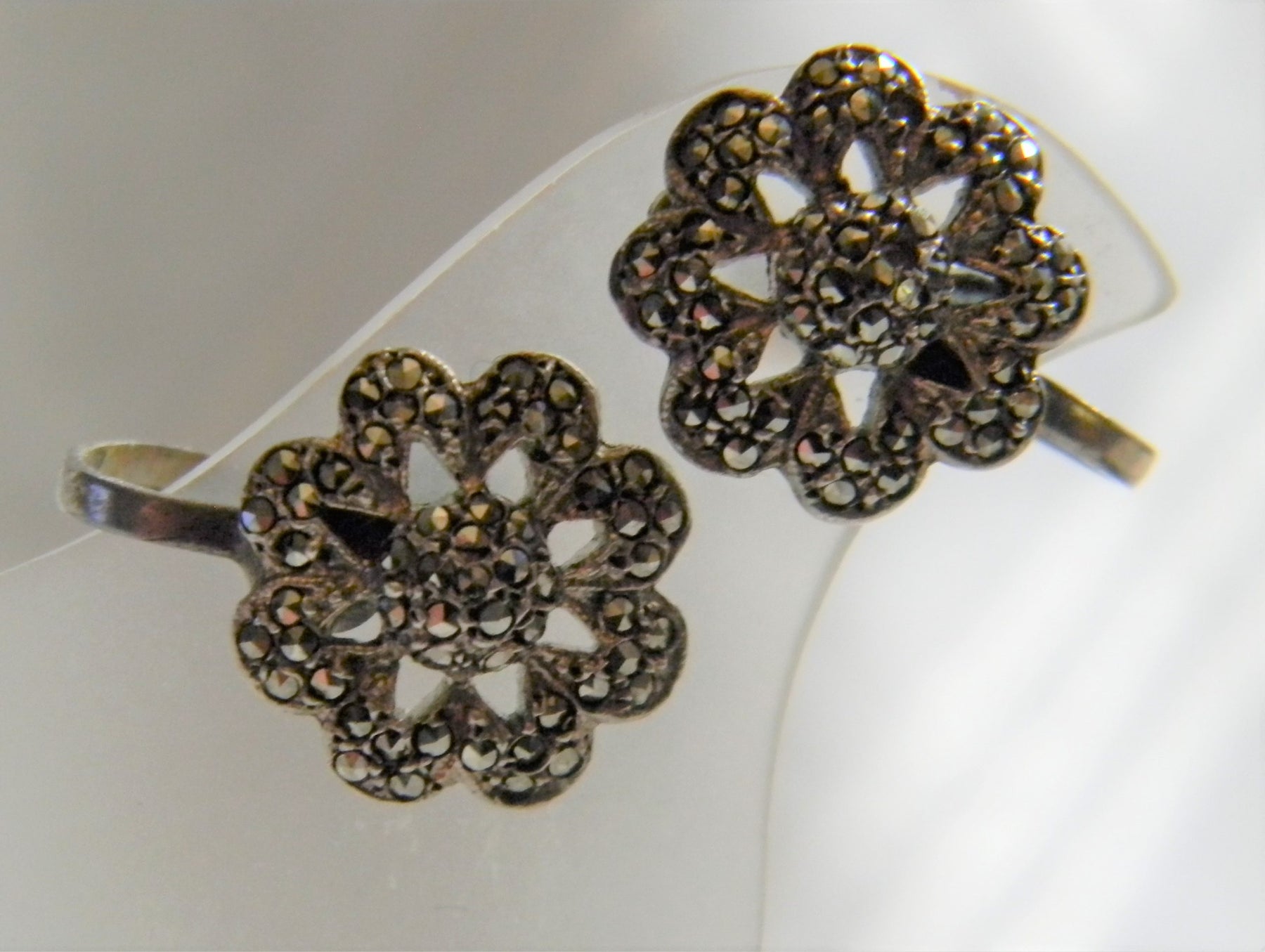 These lovely flower cluster earrings are NOT PIERCED EARRINGS. These earrings feature marcasite in the petals and the center. The backs are screw on backs for non pierced ears. The back of the earrings are marked 925.
