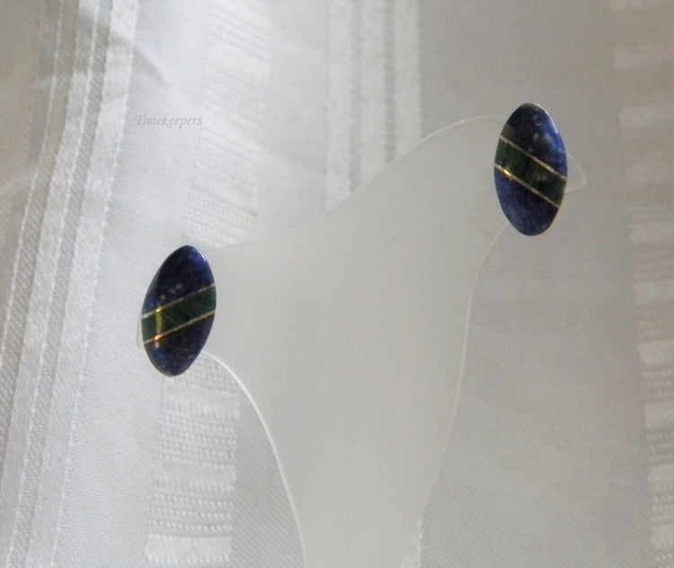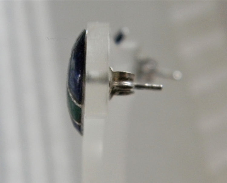 These unique earrings are an oval shape featuring a ribbon of bezel set green malachite running across the center with a blue enamel finish on either end. These earrings are not marked but have been tested to sterling.