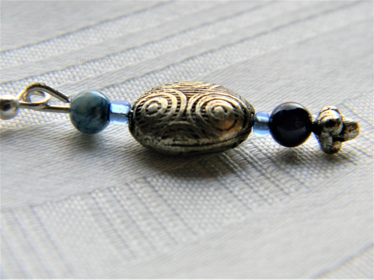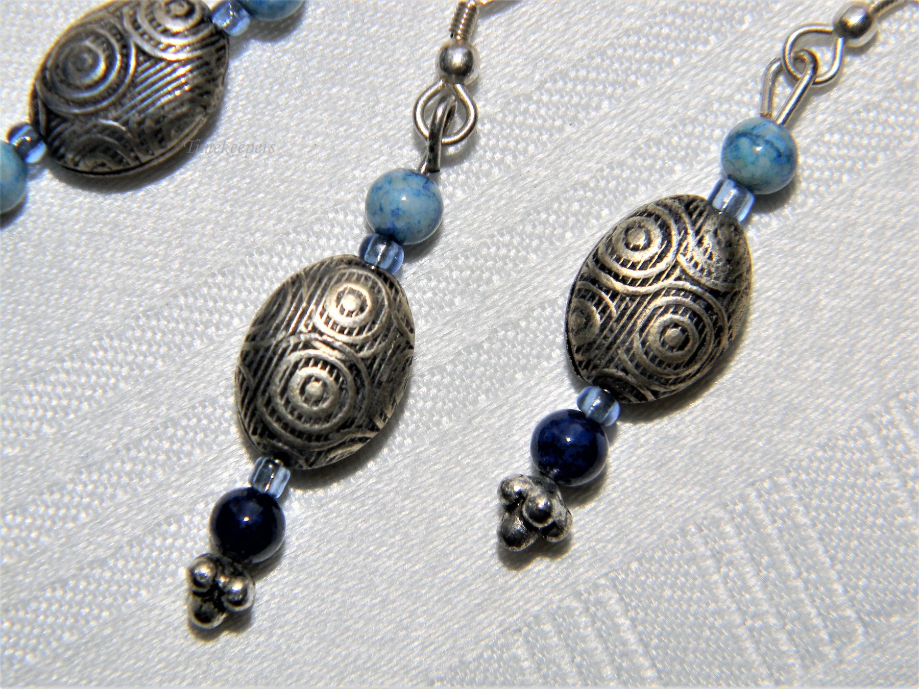 Pre-owned item. Great condition. Sold as is, as seen on pictures. Beautiful necklace and earring set featuring light and dark small round blue died sea fossils (4 mm), blue glass square (10 mm x 7 mm), small blue glass Czech beads (2 mm) with silver tone beads (12 mm x 8 mm) and finding.