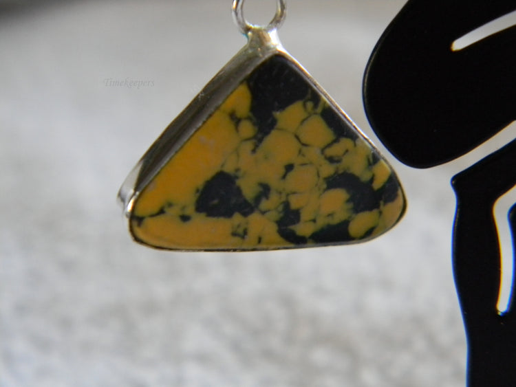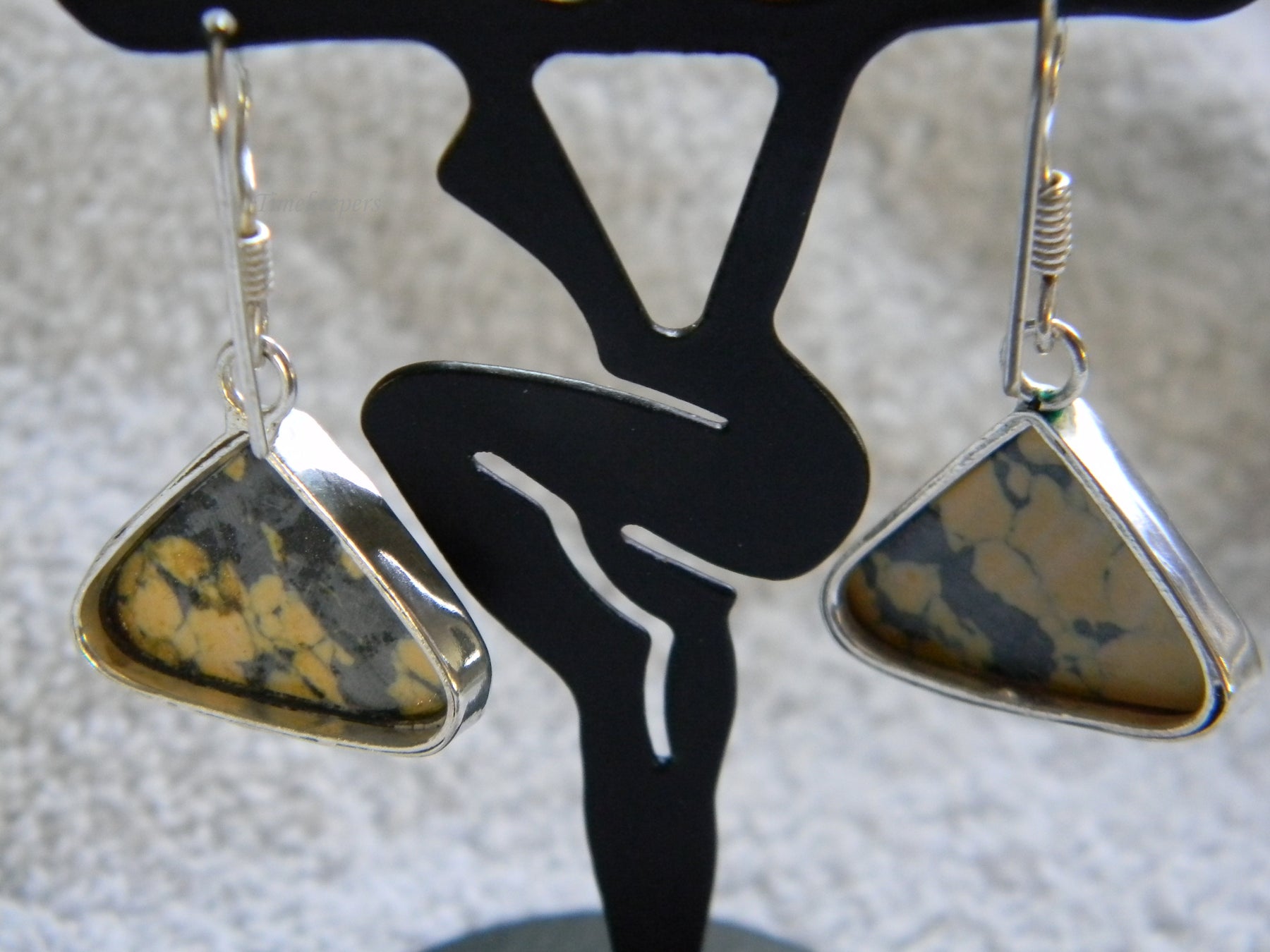 Pretty sterling triangle shape earrings on french hooks featuring triangle black and yellow jasper stones. The hooks of the earrings are both marked 925.
