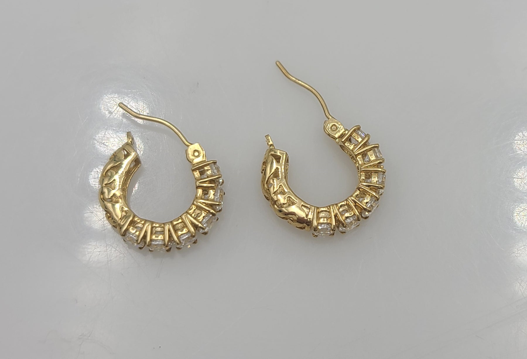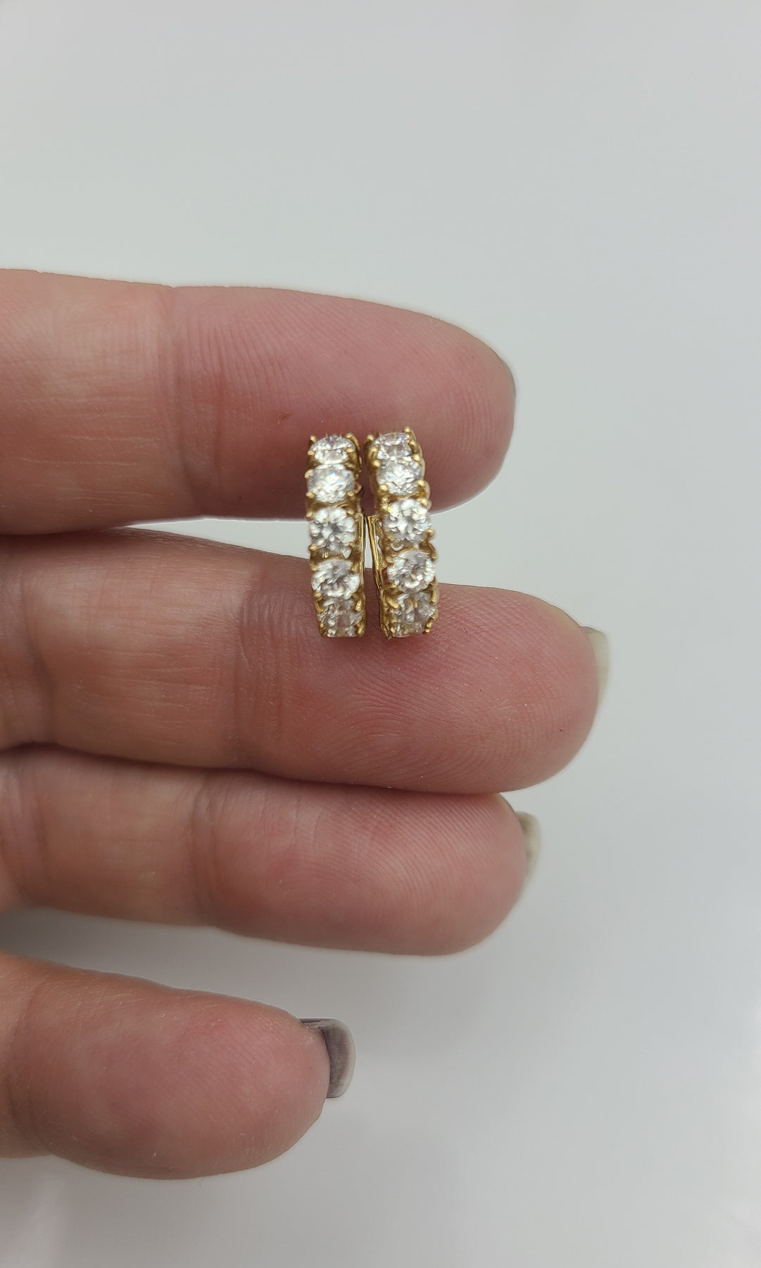 This is a nice, simple pair of 14kt yellow gold cubic zirconia hoop earrings.  Perfect for daily wear. Stamped 14k on the post of the earring. Would be a nice birthday, Christmas, Mother's Day or Valentine's Day gift for her.