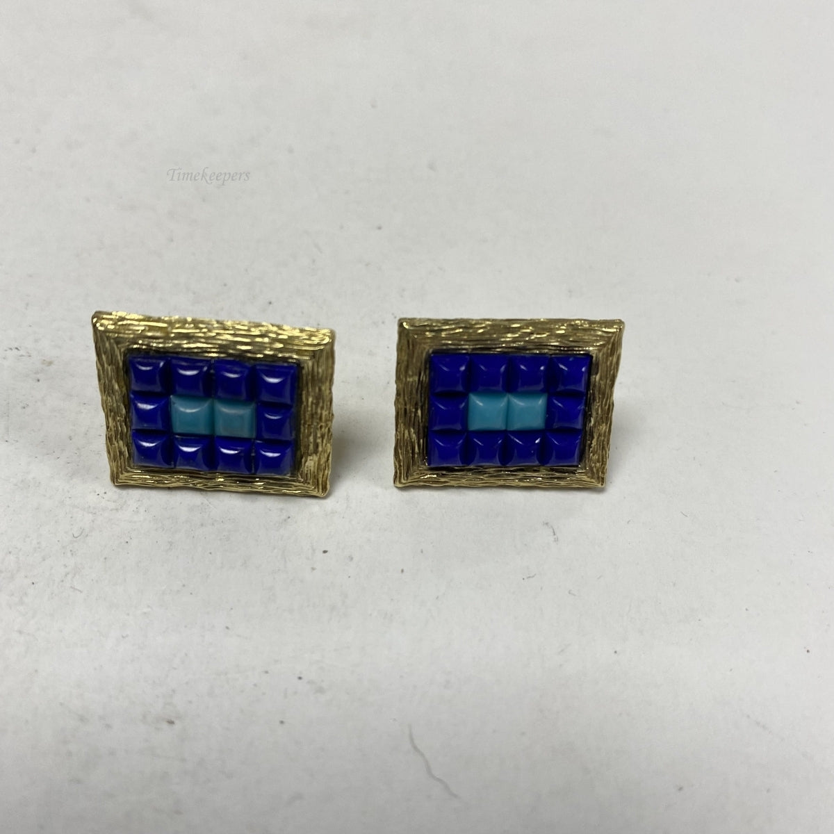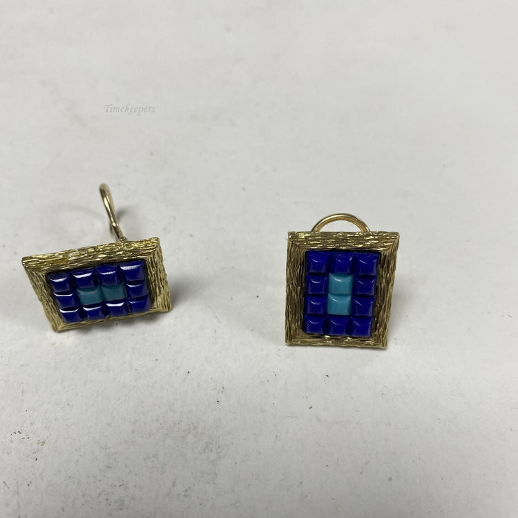 • Vintage Set of 2 earrings. 14K Yellow Gold with 10 Lapis & 2 Turquoise Center Decor on each earring, each stone 3mm x 3mm.
