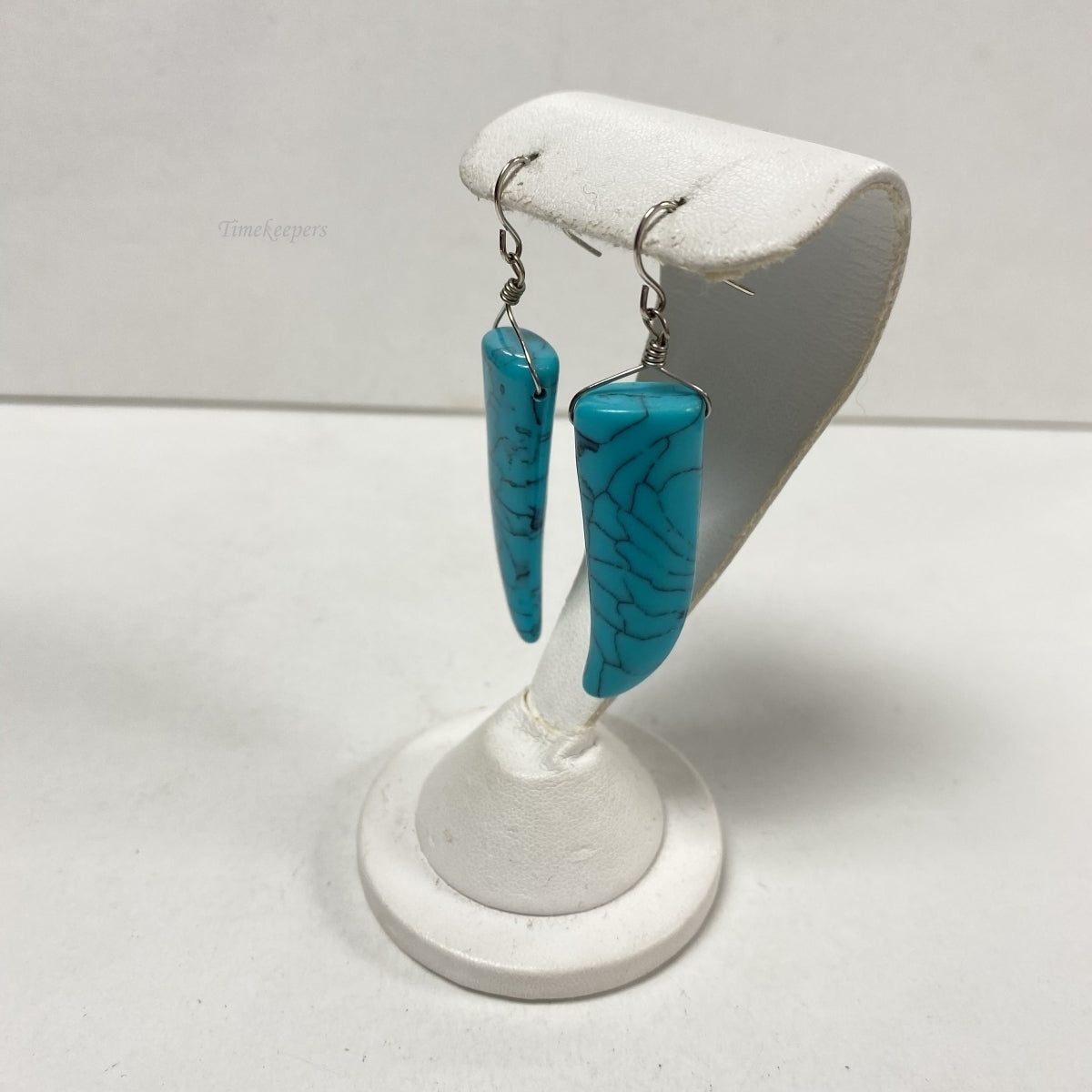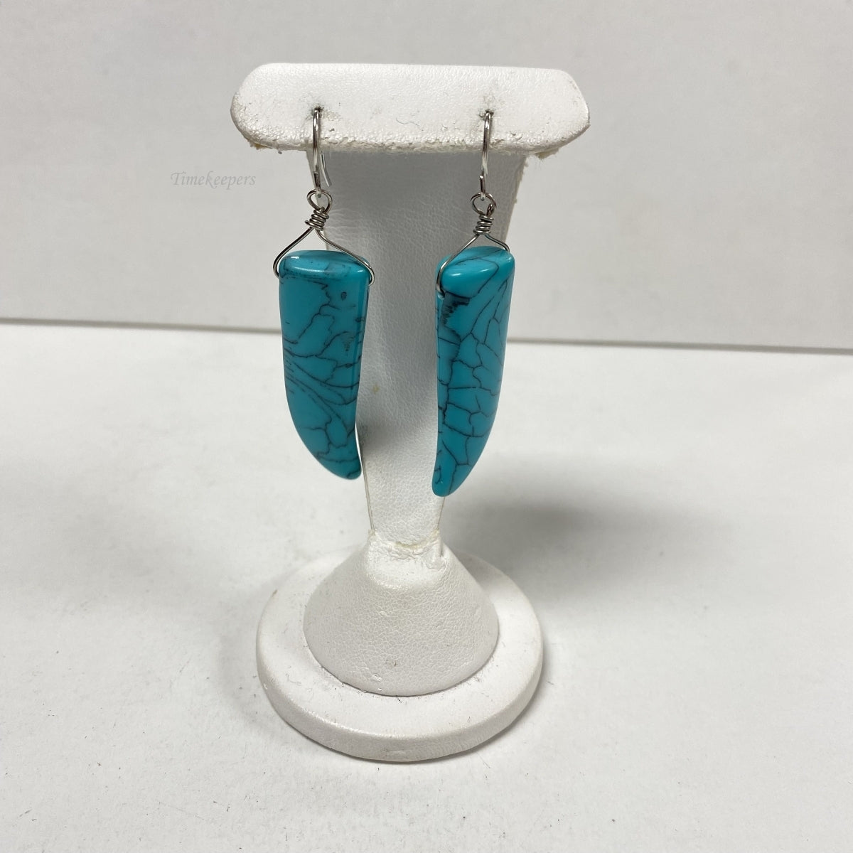 - One Pair Silver tone earrings with 2 Blue Pepper Shape stones (1 5/8 x 13mm x 7mm thick), drop/dangle style.