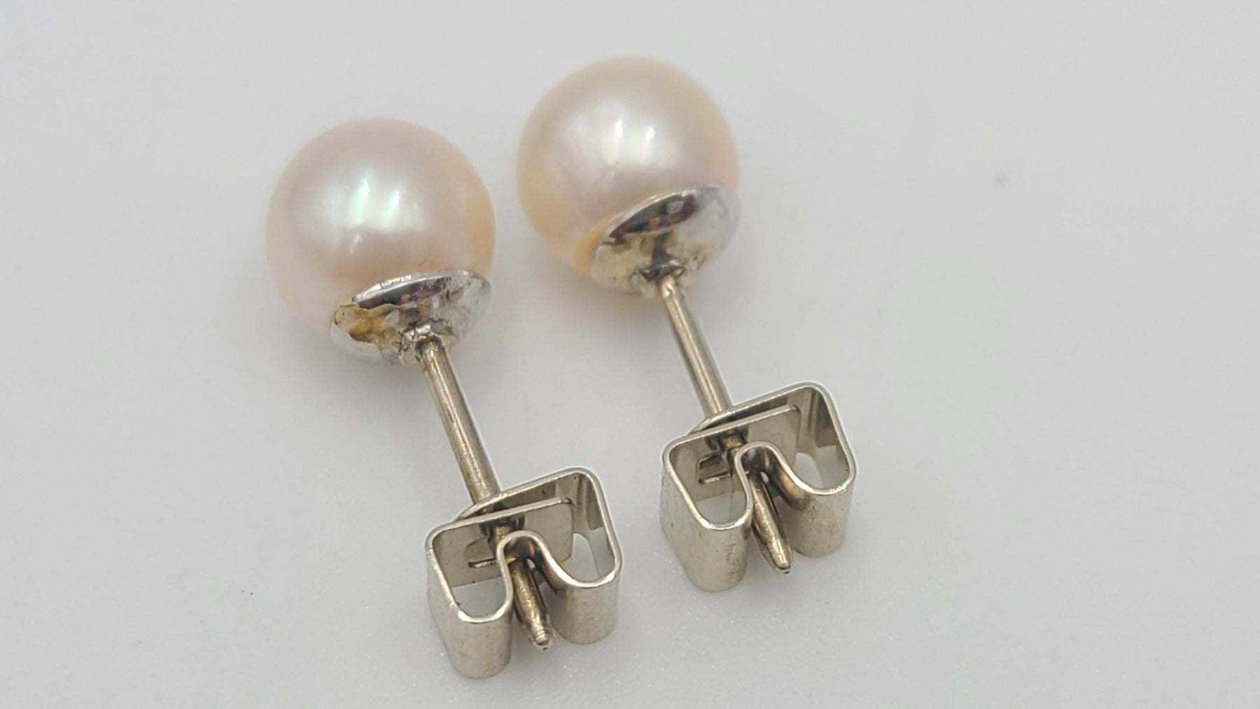 These are a lovely pair of pearl earrings set in 14kt white gold. Earrings are not stamped, but have been acid tested for gold purity. Would be a nice anniversary, birthday, graduation, Mother's Day or Valentine's Day gift for her!