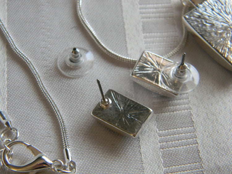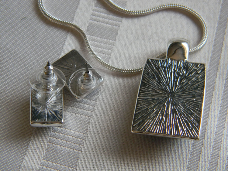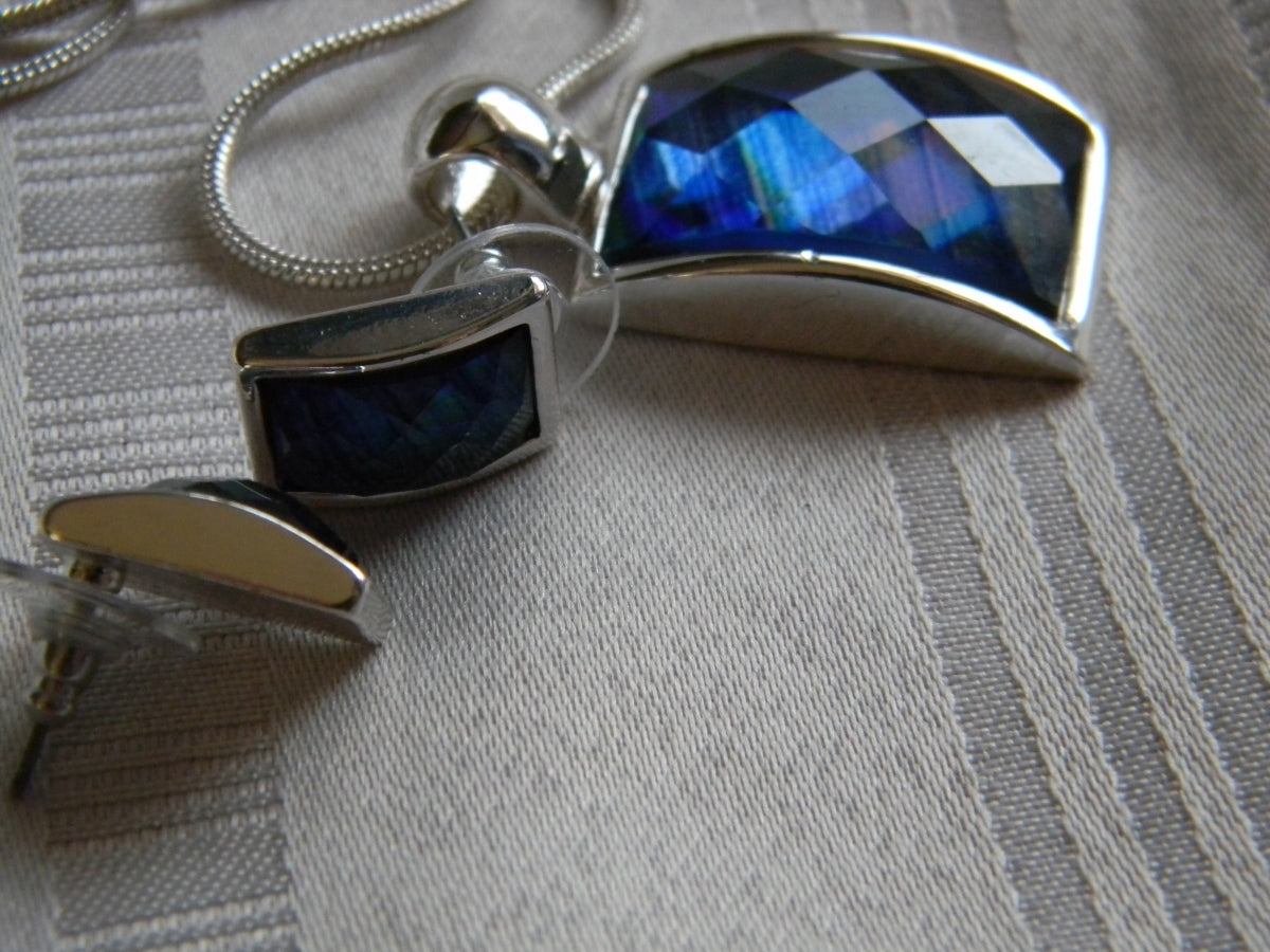This is a stunning necklace and earring set in silver tone with faceted blue stones. This is an adjustable length necklace.