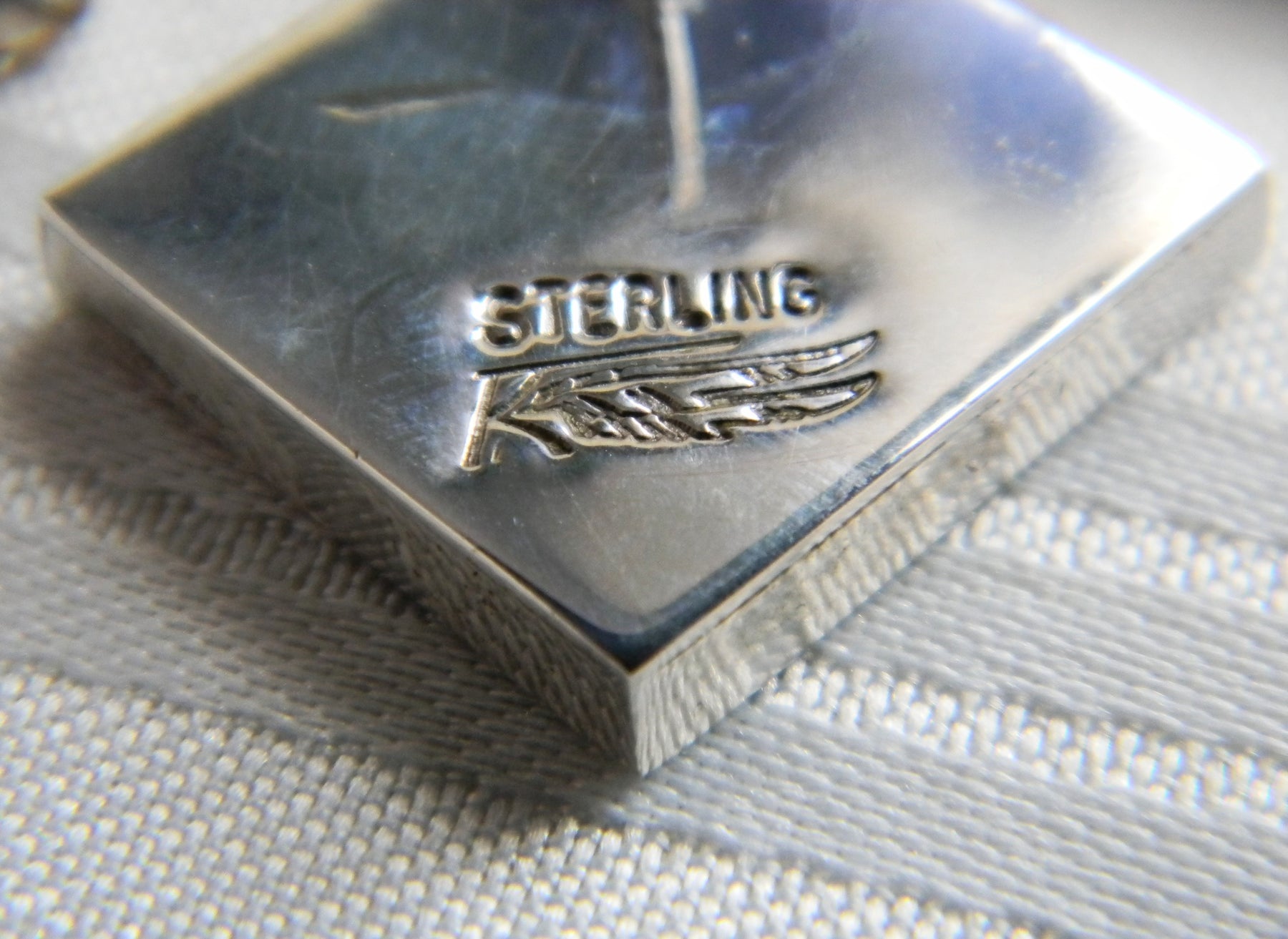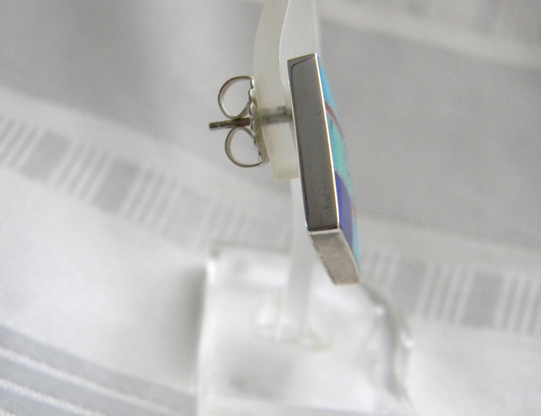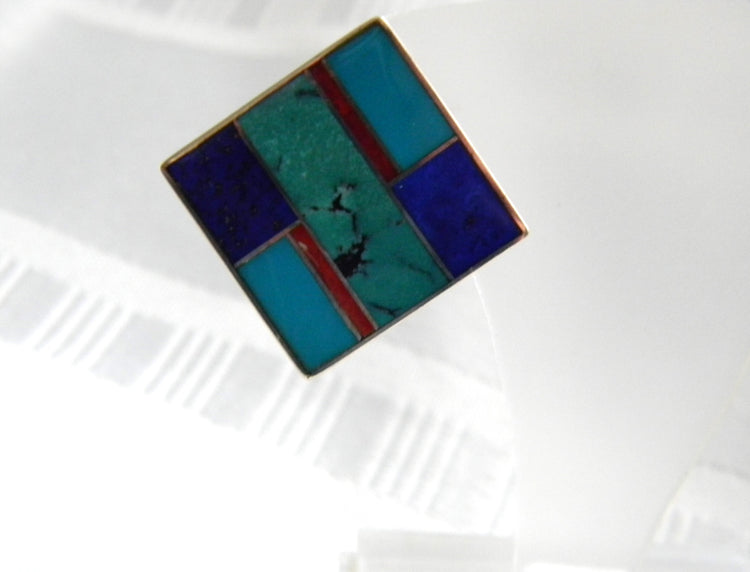 These lovely earrings are inlaid with turquoise, lapis and carnelian.  The post is set in one corner of the rectangle to provide the diamond shape.  The back of each earring stamped Sterling with a feather.