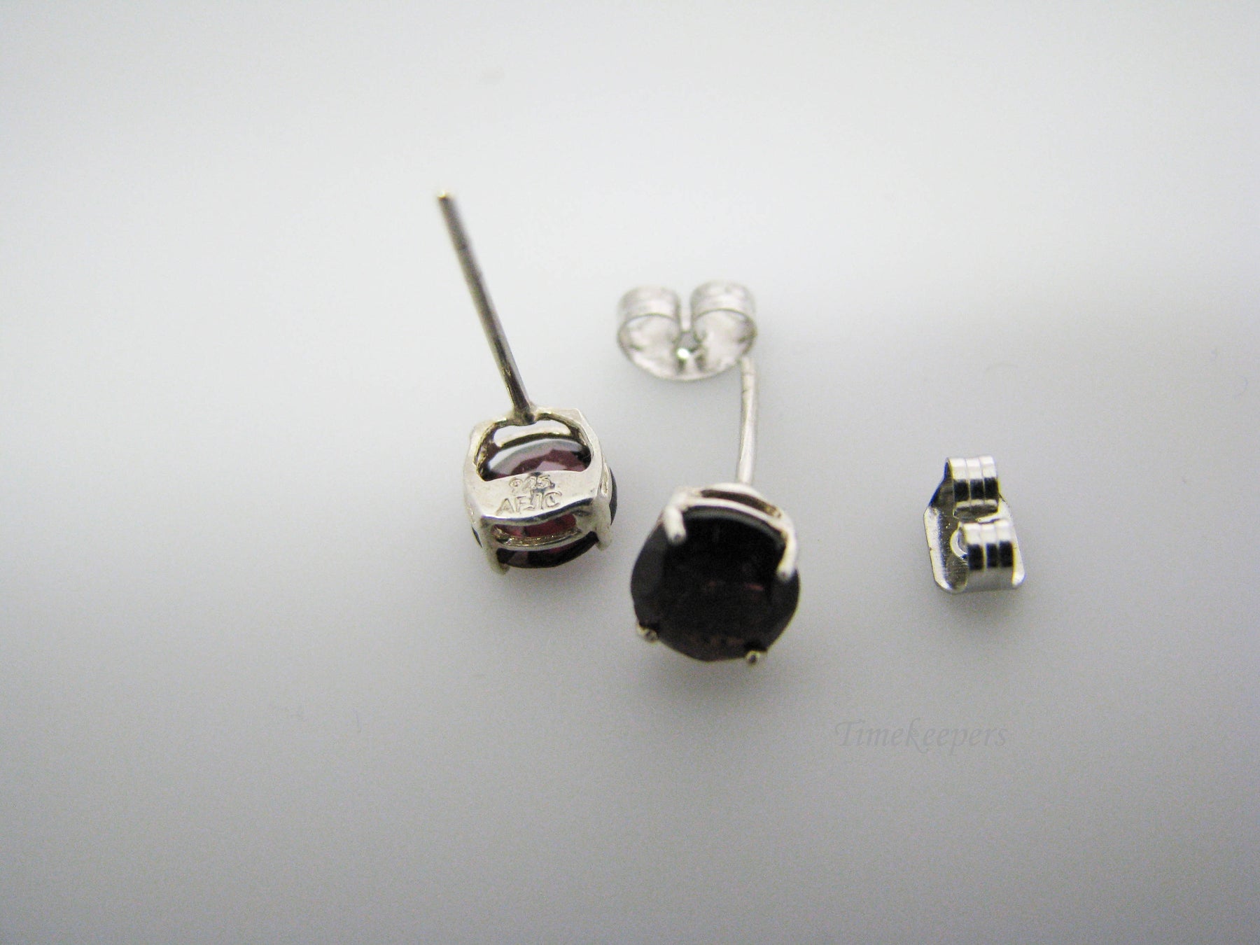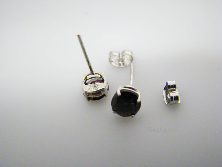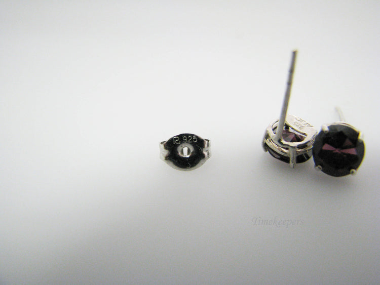 Sterling silver mountings with prong set dark red stones. The earrings and the backs are both marked 925.