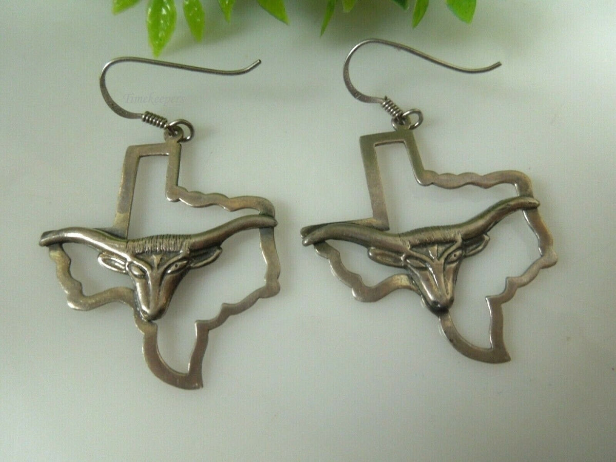 r027 Vintage Sterling Silver Long Horn Cattle Head Dangle and Drop Earrings