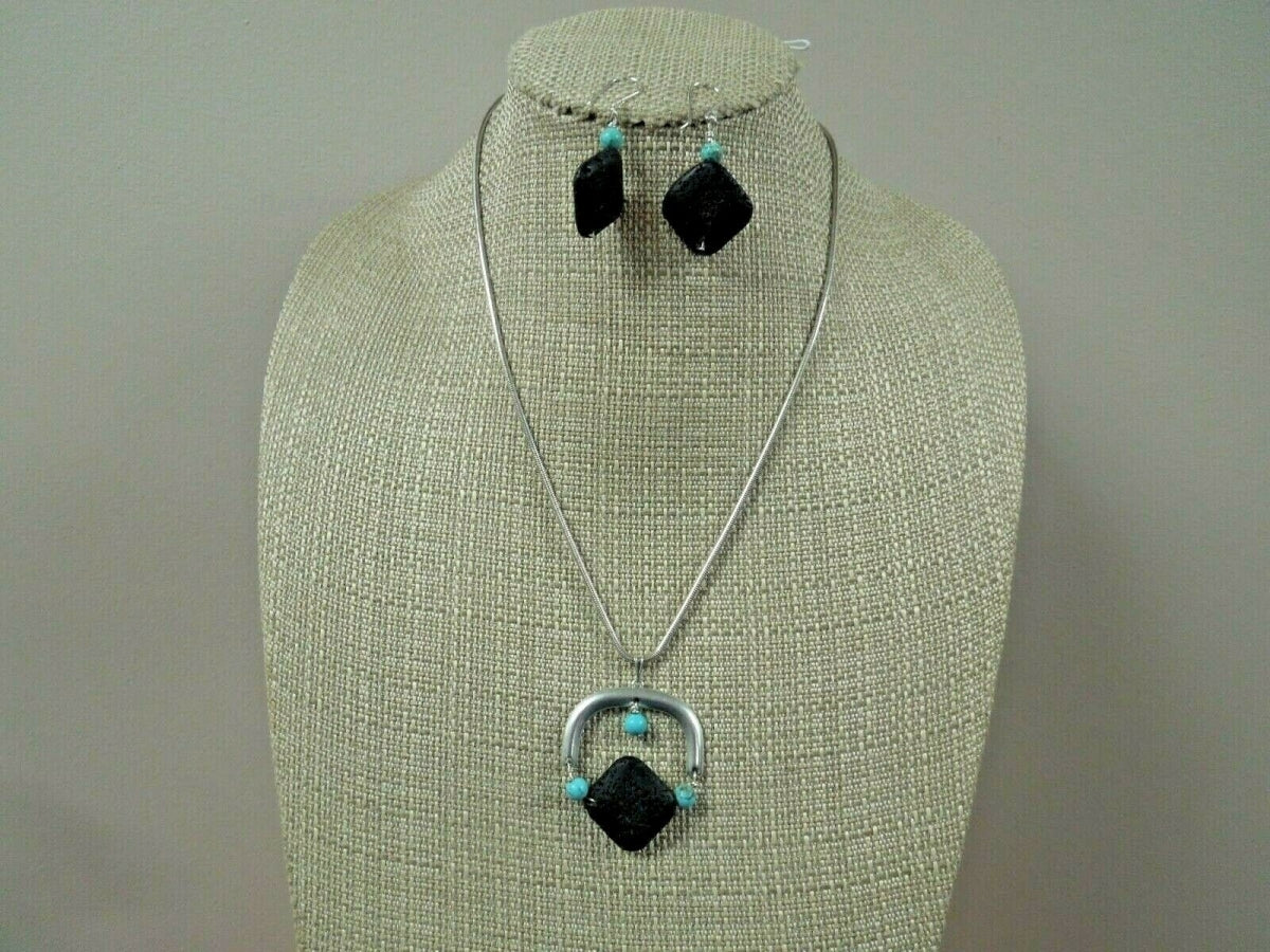 q782 Unique Sterling Silver Necklace with Lava Rock Pendant and Dangle Earrings Stamped