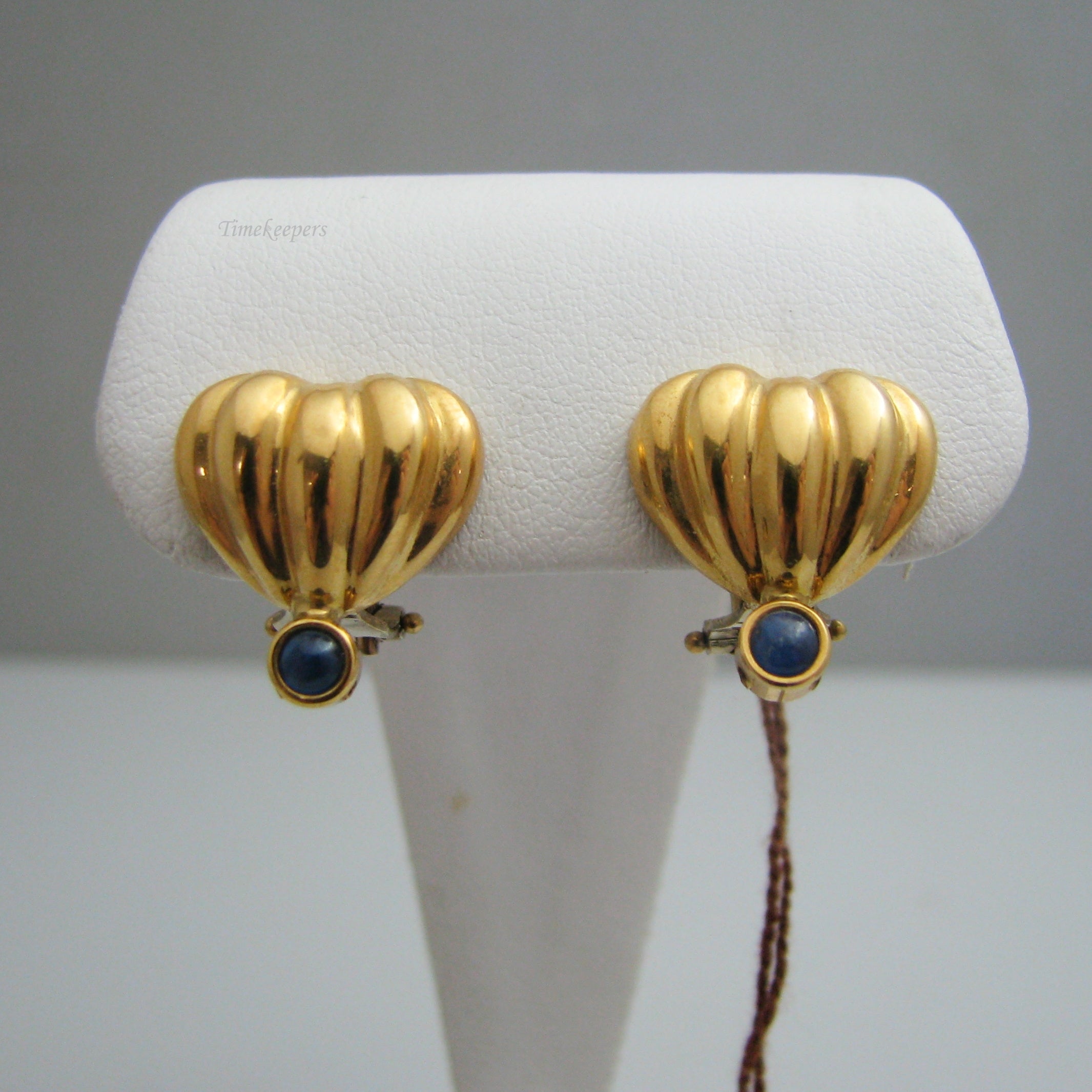 d963 Pretty 18k Yellow Gold Blue Cabochon Stone Heart Shell Earrings