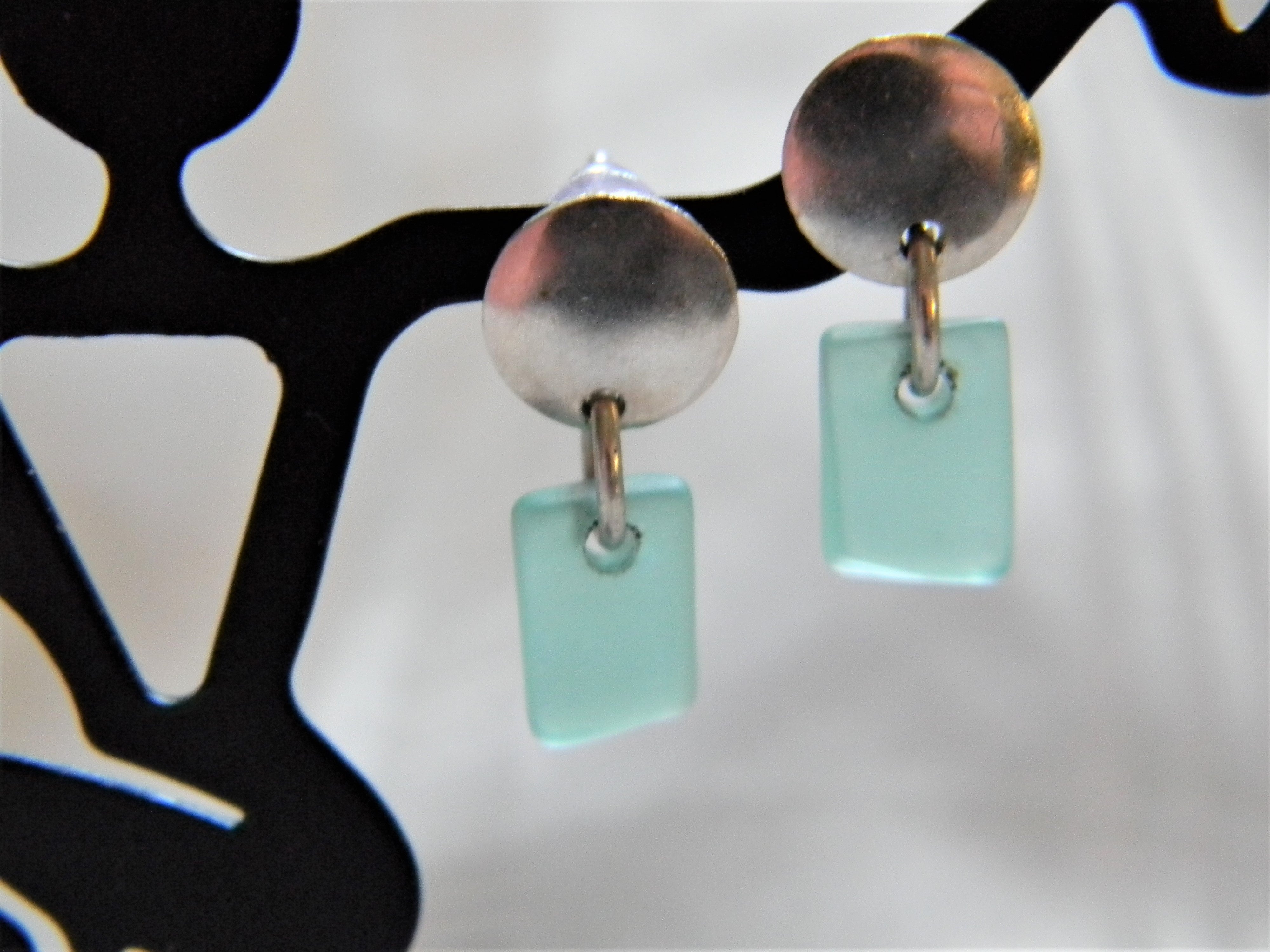 h487 Unique Sterling Silver Stud Pierced Earrings with Hanging Blue Resin Square