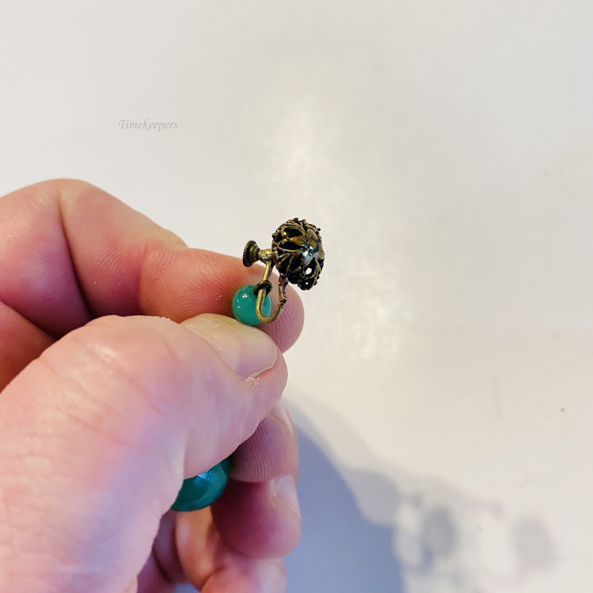 f595 Vintage Gold Tone Green Jade Dangle Screw-on Earrings