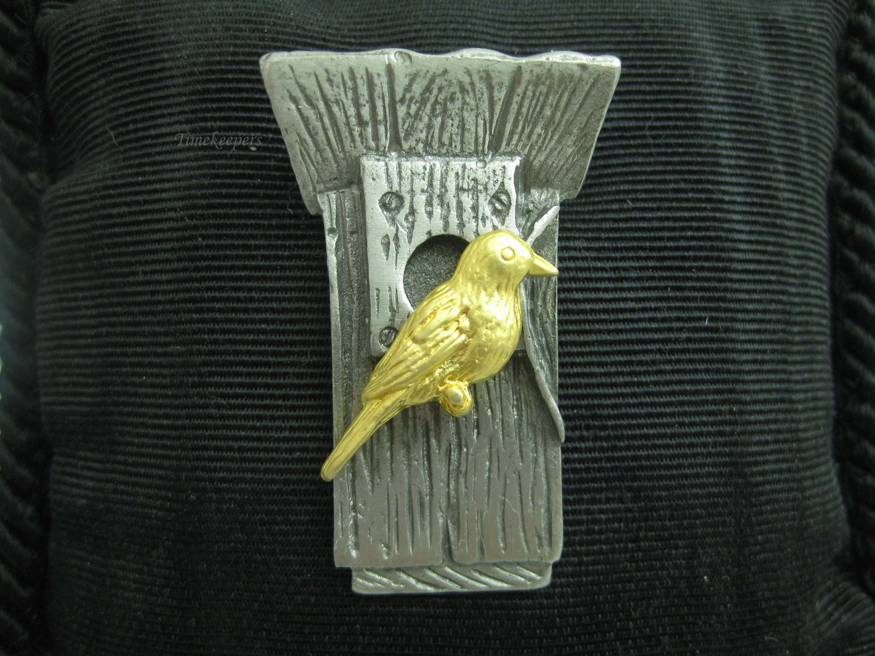 b677 Cute Little Gold Tone Bird Perched on a Pewter Birdhouse