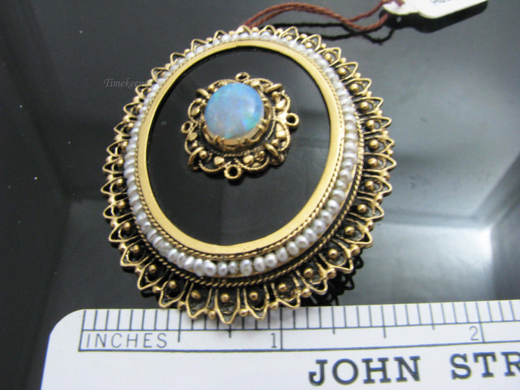b817 Beautiful 14kt Yellow Gold Opal, Onyx, and Seed Pearl Brooch Pendant