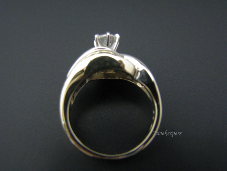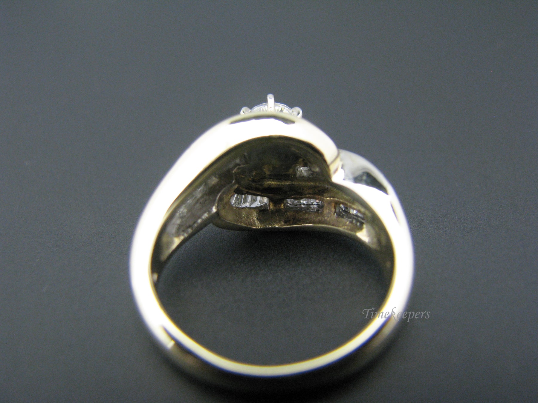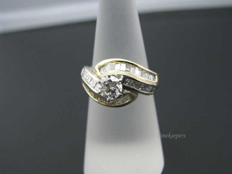 This pretty ring features (2) rows of coming up from either side and encircling the center diamond. One row of the diamonds are round cut and one row are tapered baguettes. The inside of the ring is stamped 14k. This ring does have a lot of sparkle!!