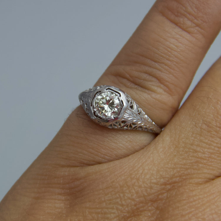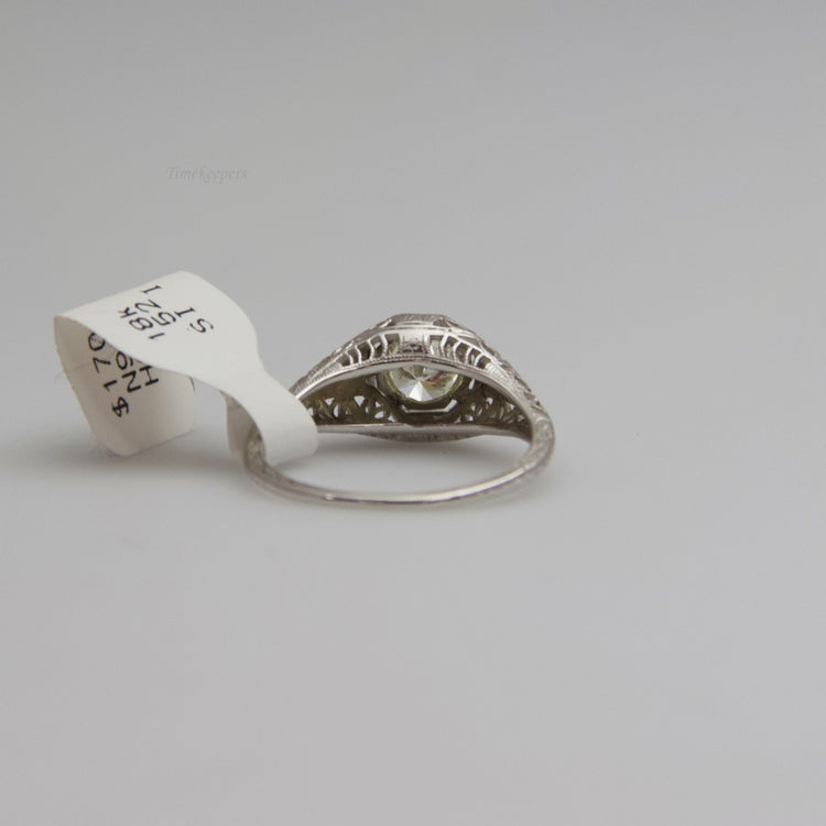 This white gold diamond ring contains one large diamond. Its band is decorated with a delicate web-like design. This ring is not stamped, but has been tested for authenticity.