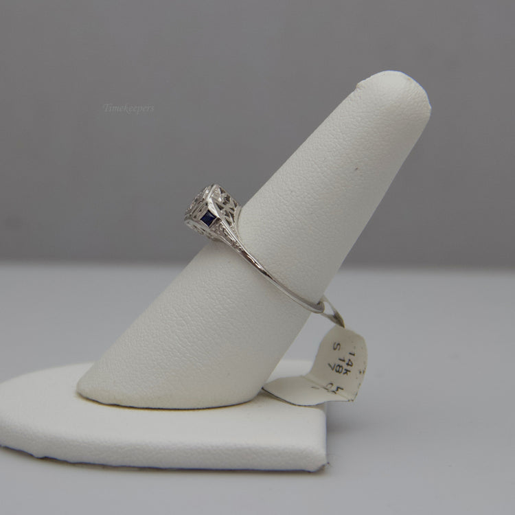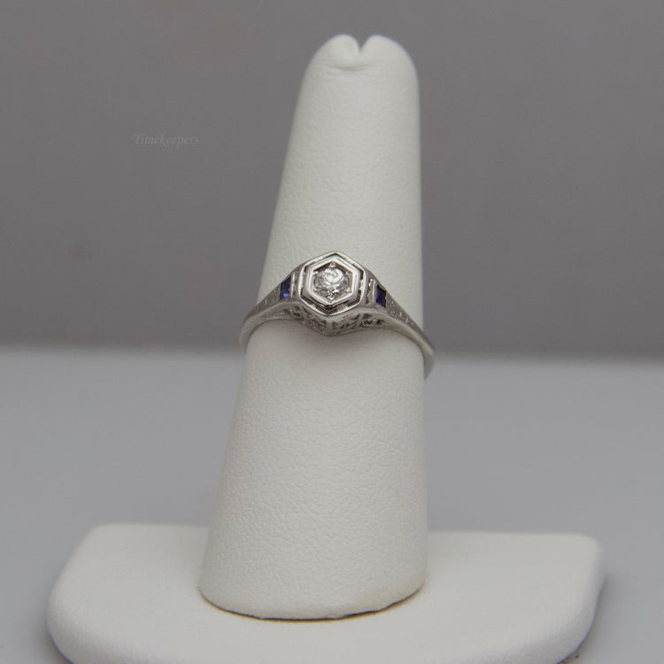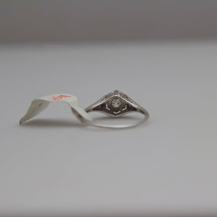This gorgeous ring contains one diamond (round cut) and two sapphires (square cut) that are accentuated by the fine filigree detailing in the band. This ring is not stamped, but has been tested for authenticity.