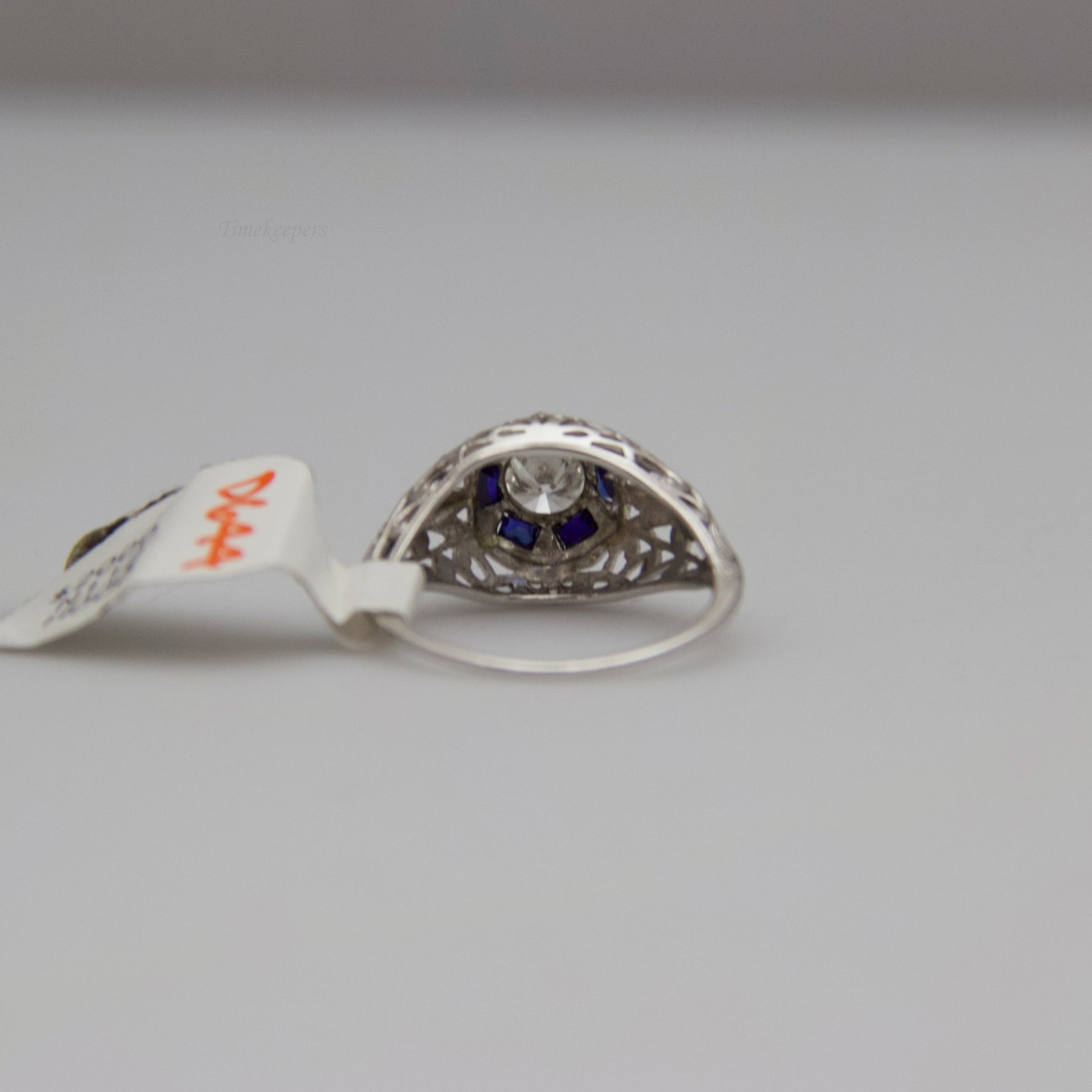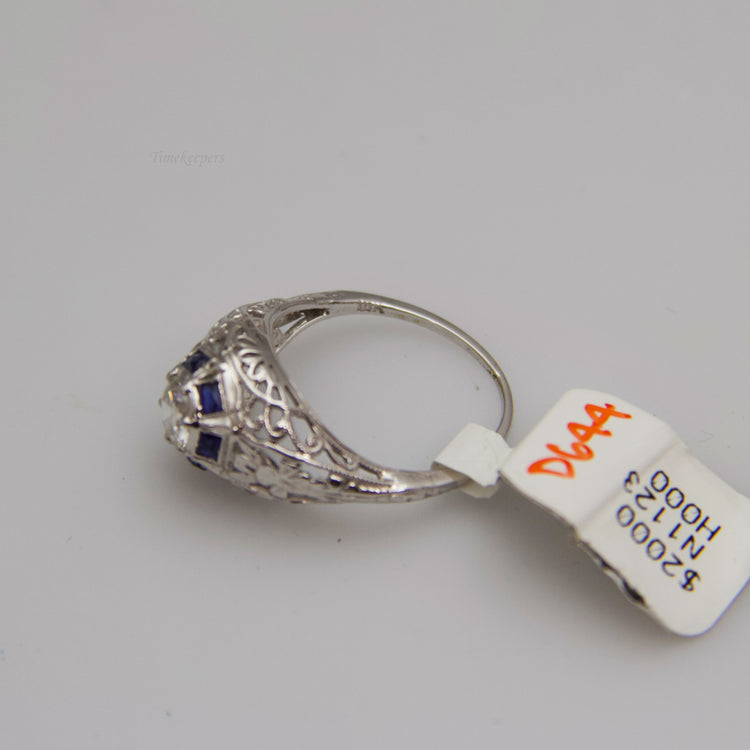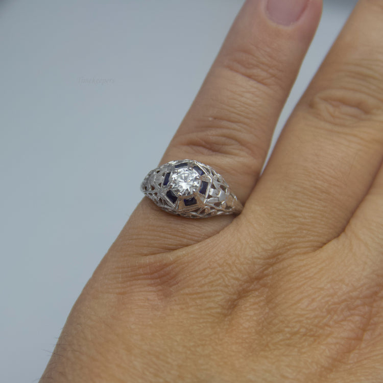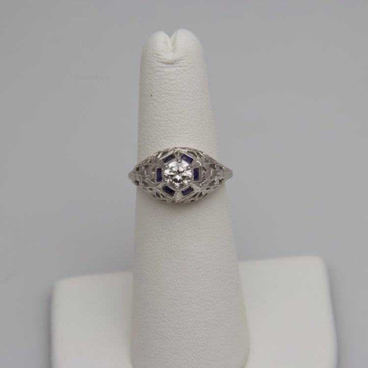 This ring contains one diamond (round cut) and six sapphires (baguette cut) that are accentuated by the fine filigree detailing in the band.