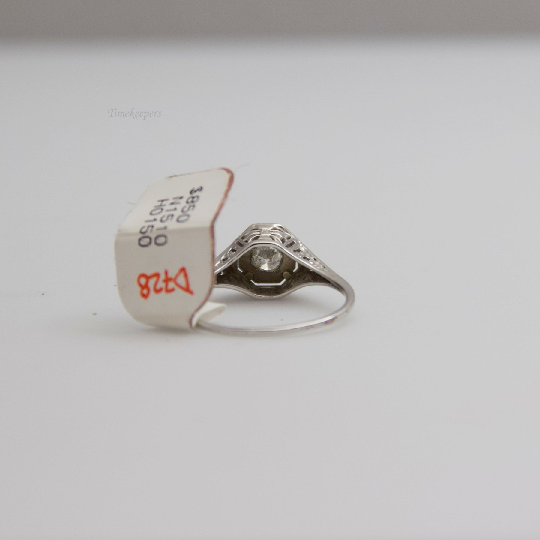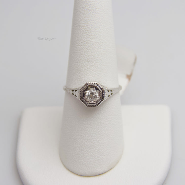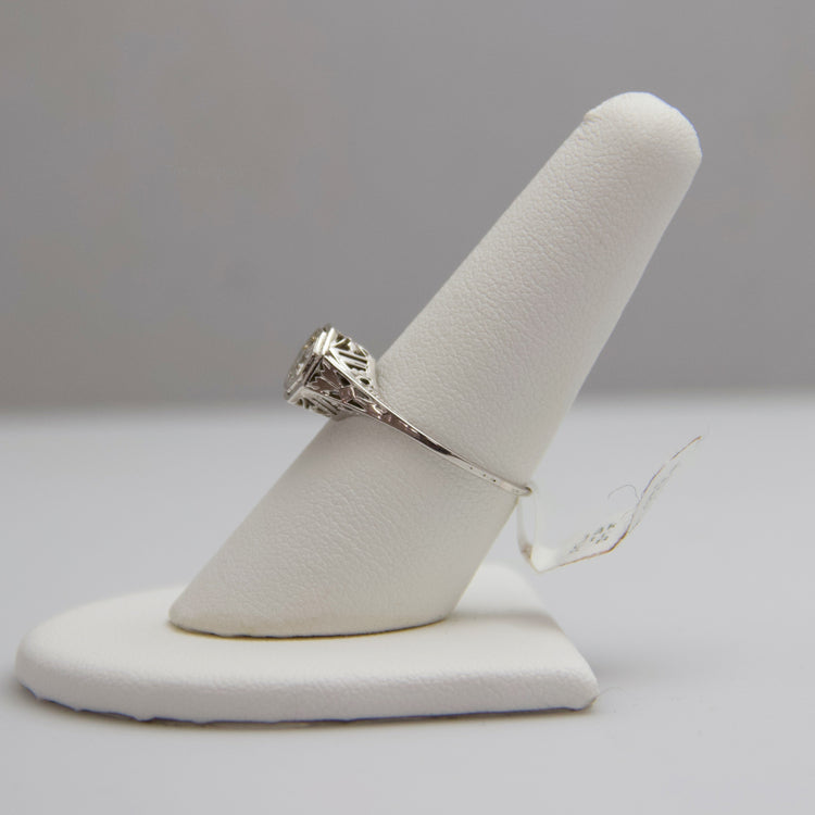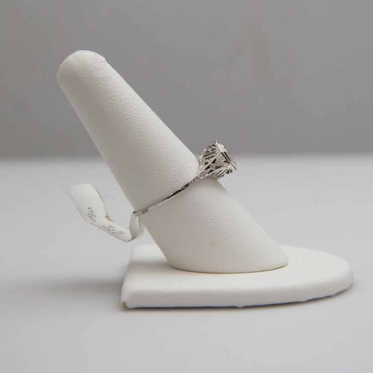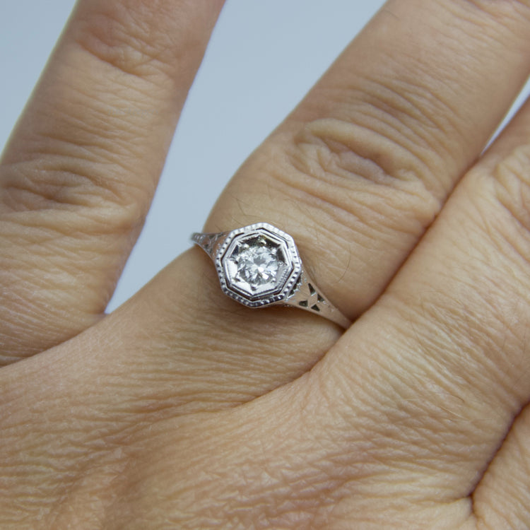 This ring contains one large diamond (round cut) which is accentuated by the filigree band. This ring is not stamped, but has been tested for authenticity.