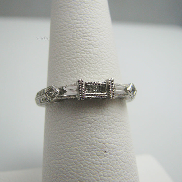 This ring set contains 12 diamonds total — 5 diamonds on the engagement ring, and 7 diamonds on the wedding ring. The centerpiece of the engagement ring is round cut, and the other diamonds are a mixture of square cut, round cut, and tapered baguette cut. Both rings are stamped.
