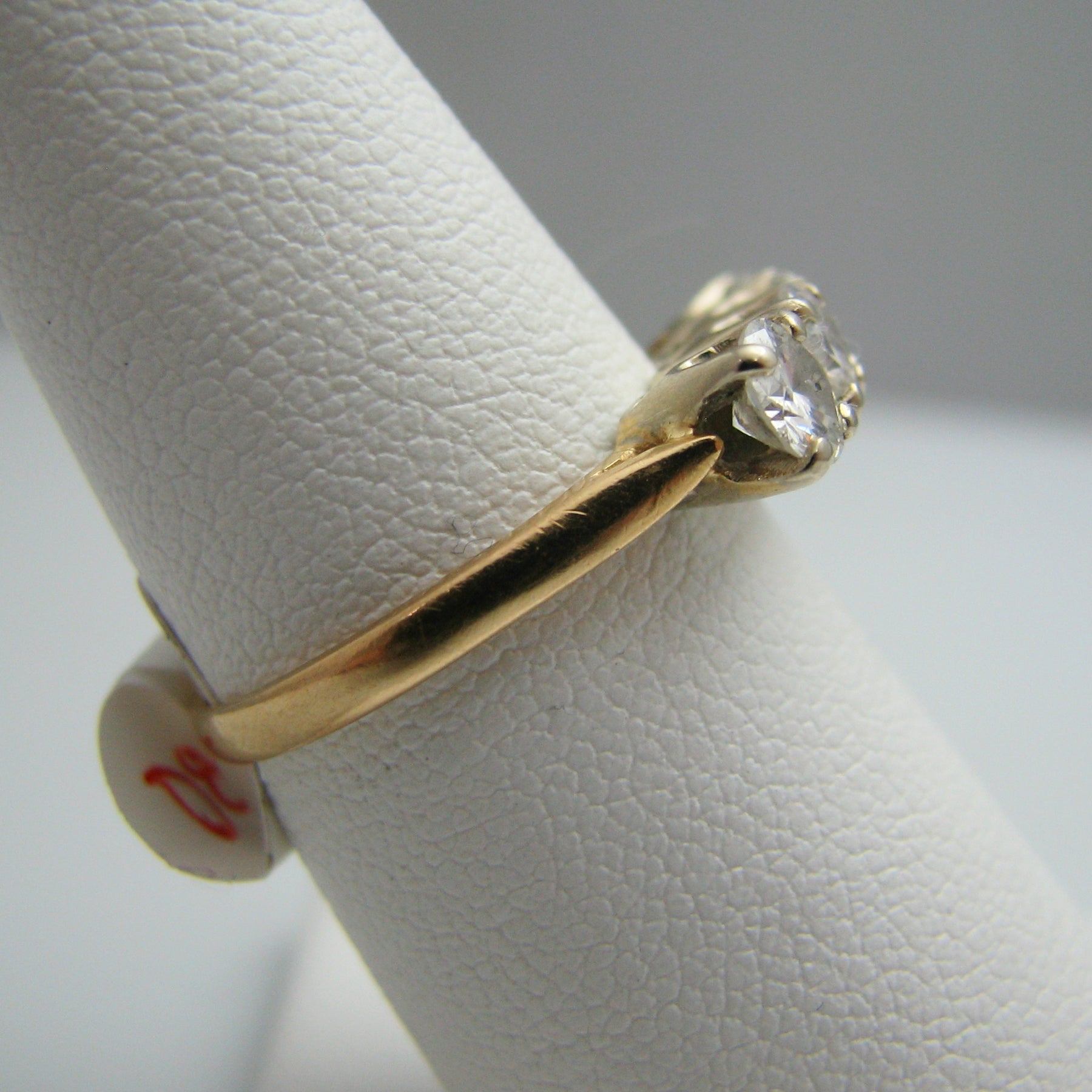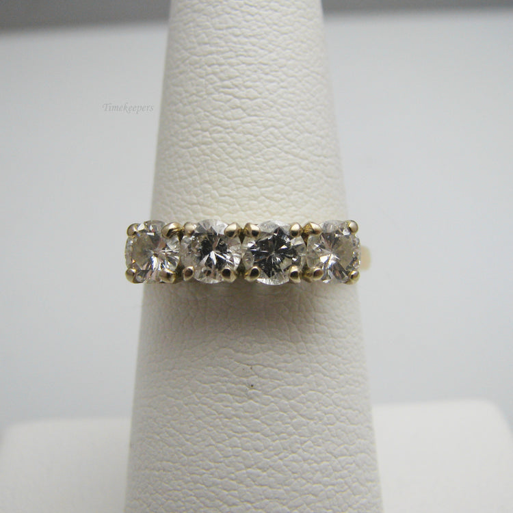This ring contains four (4) diamonds, all of which are round cut. It is stamped.