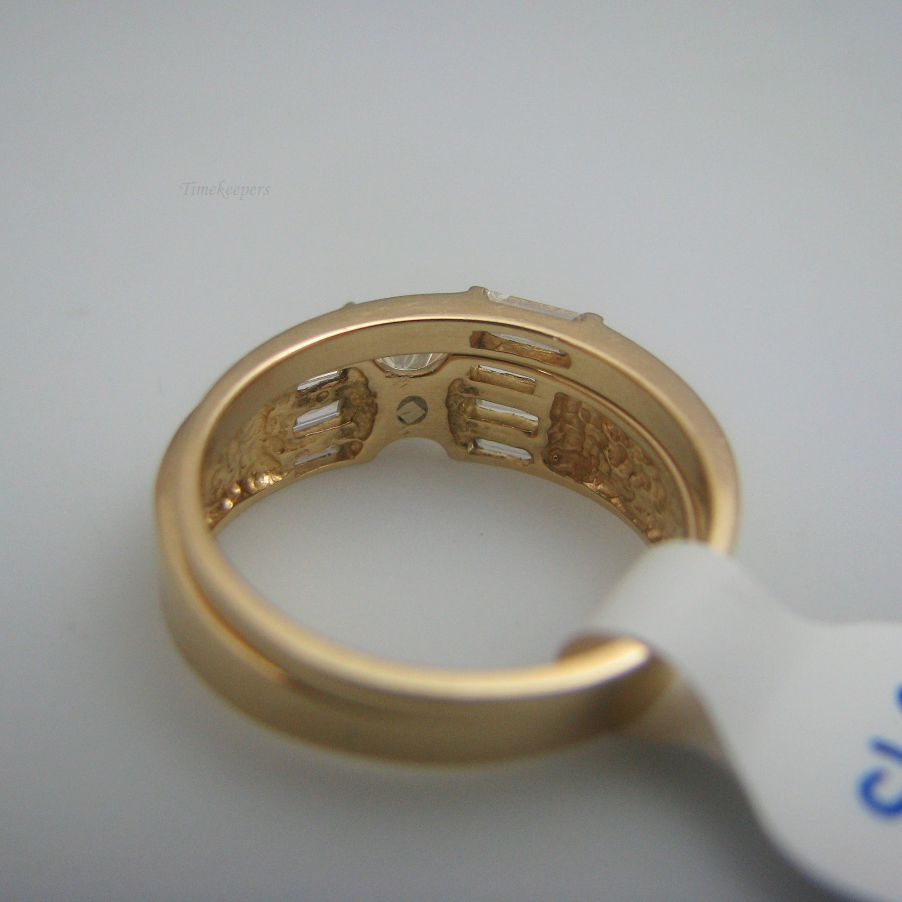 This ring set contains eight (8) diamonds. One diamond is on the wedding band, and seven (7) diamonds are on the engagement ring. All diamonds except for the centerpiece are baguette cut. The centerpiece is round cut. Both rings are stamped.