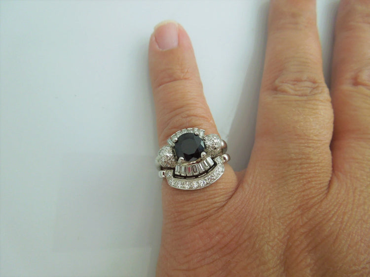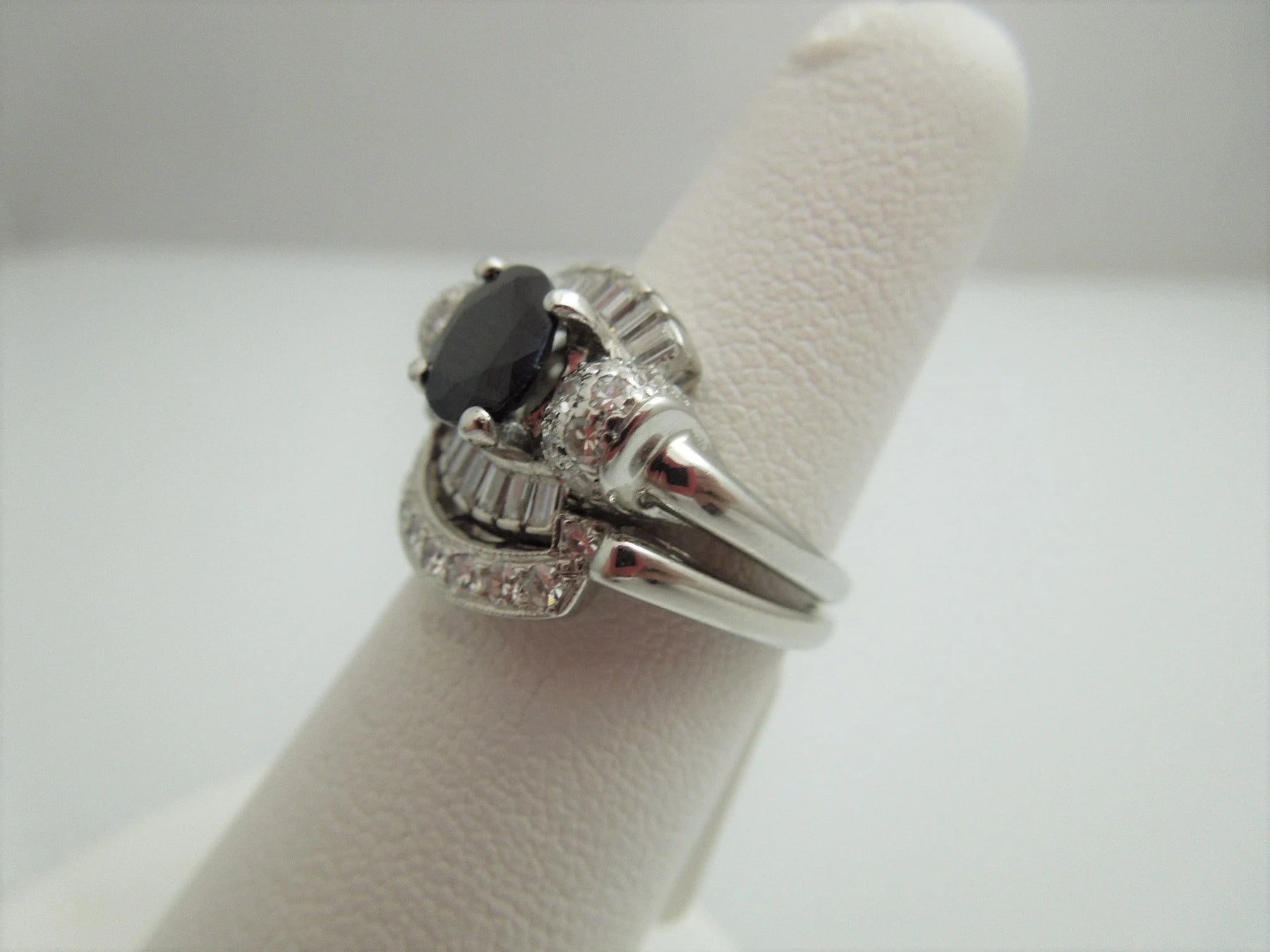 This is a lovely 14kt white gold wedding set. With a large 1.25ct sapphire in its center, it features beautifully laid round and baguette diamonds surrounding the center stone. Wedding ring sits and fits into its band. Band is stamped 14k. Engagement ring is not stamped, but has been tested for gold purity. Would be a lovely wedding set to propose with!!