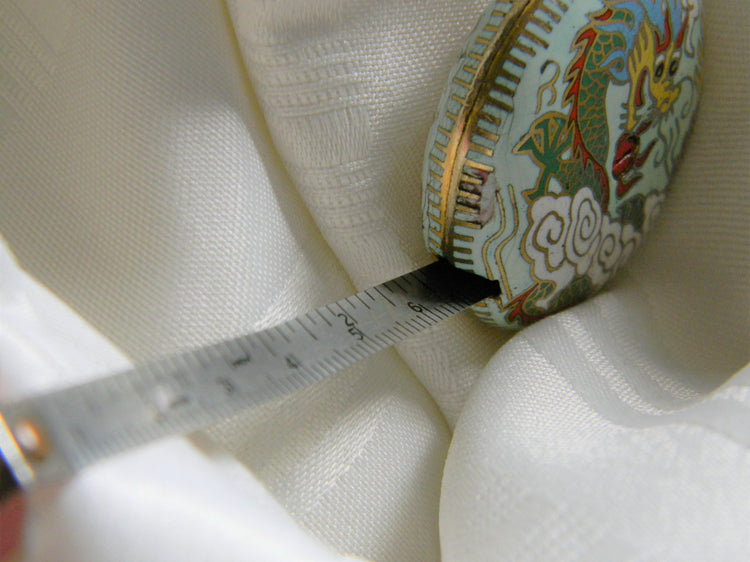 This beautiful enamel dragon design tape measure is very colorful. The tape measure is on a gold tone key chain. The tape does work and goes out to 36". The tape itself is approx. 5 mm wide.