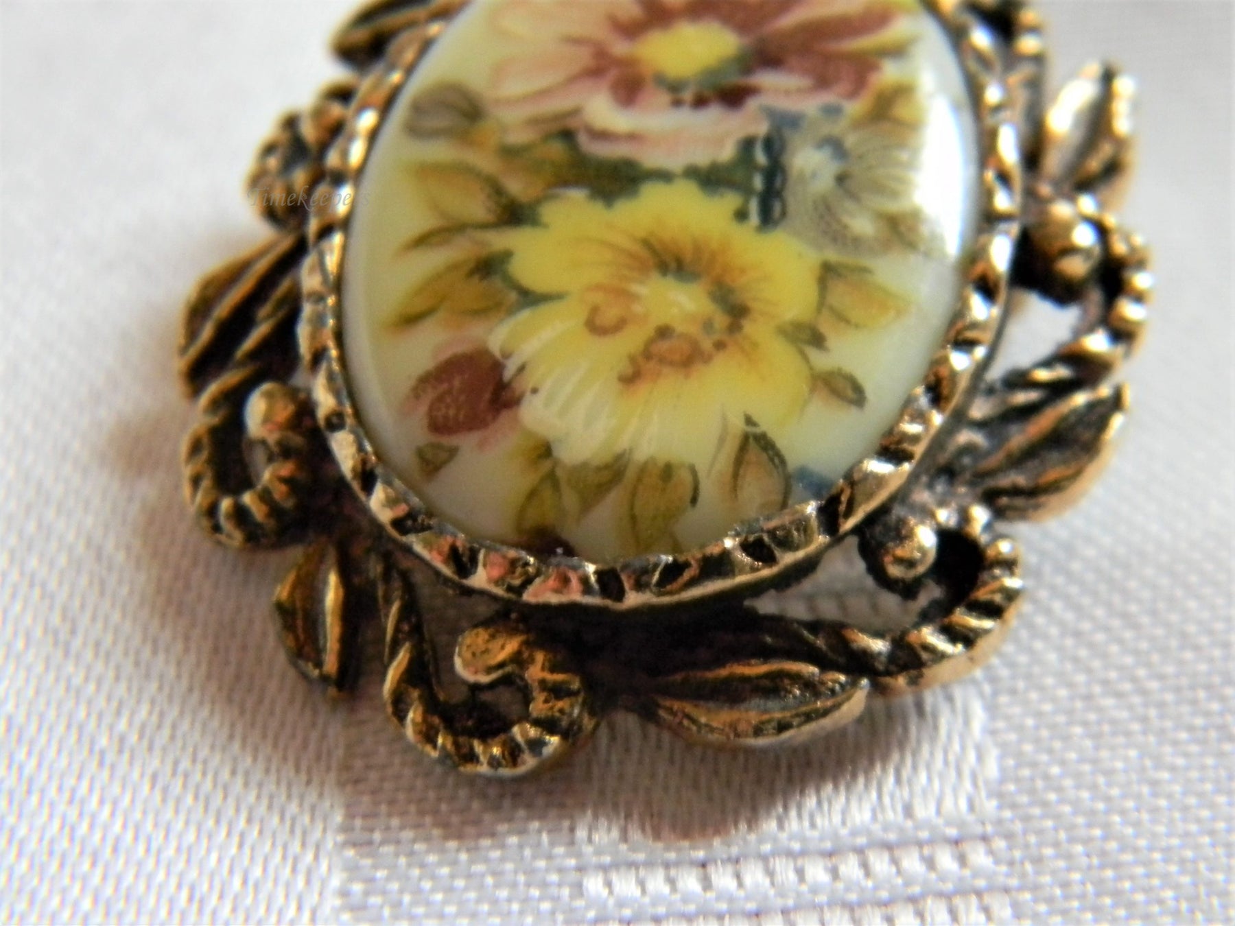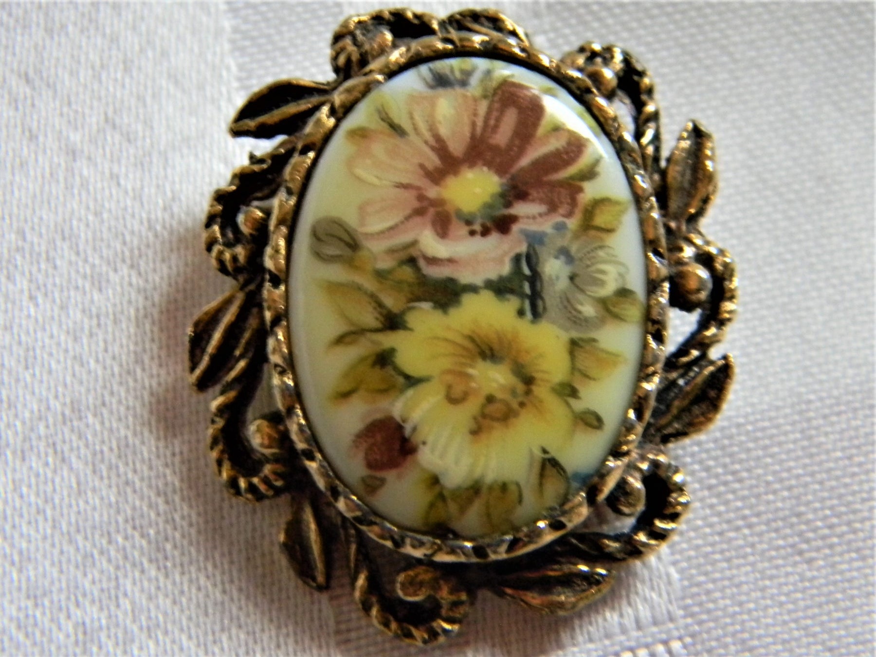 For Sale: (1) Vintage Oval Brooch with Painted Flowers in Gold Tone