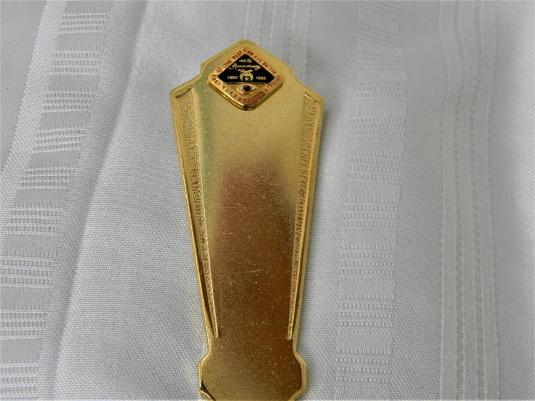 For Sale is: (1) Special Masonic 100th Anniversary Letter Opener in Gold Tone Please Read ENTIRE DESCRIPTION BEFORE PURCHASING This is a nice letter opener. Letter opener depicts the Mason's 100th anniversary 1893-1993. This piece does show small scratches from age and use. This is being sold as is. Specifics: Letter Opener is approx. 7 5/8" long x 1 3/8" at widest point As is - As shown in pictures