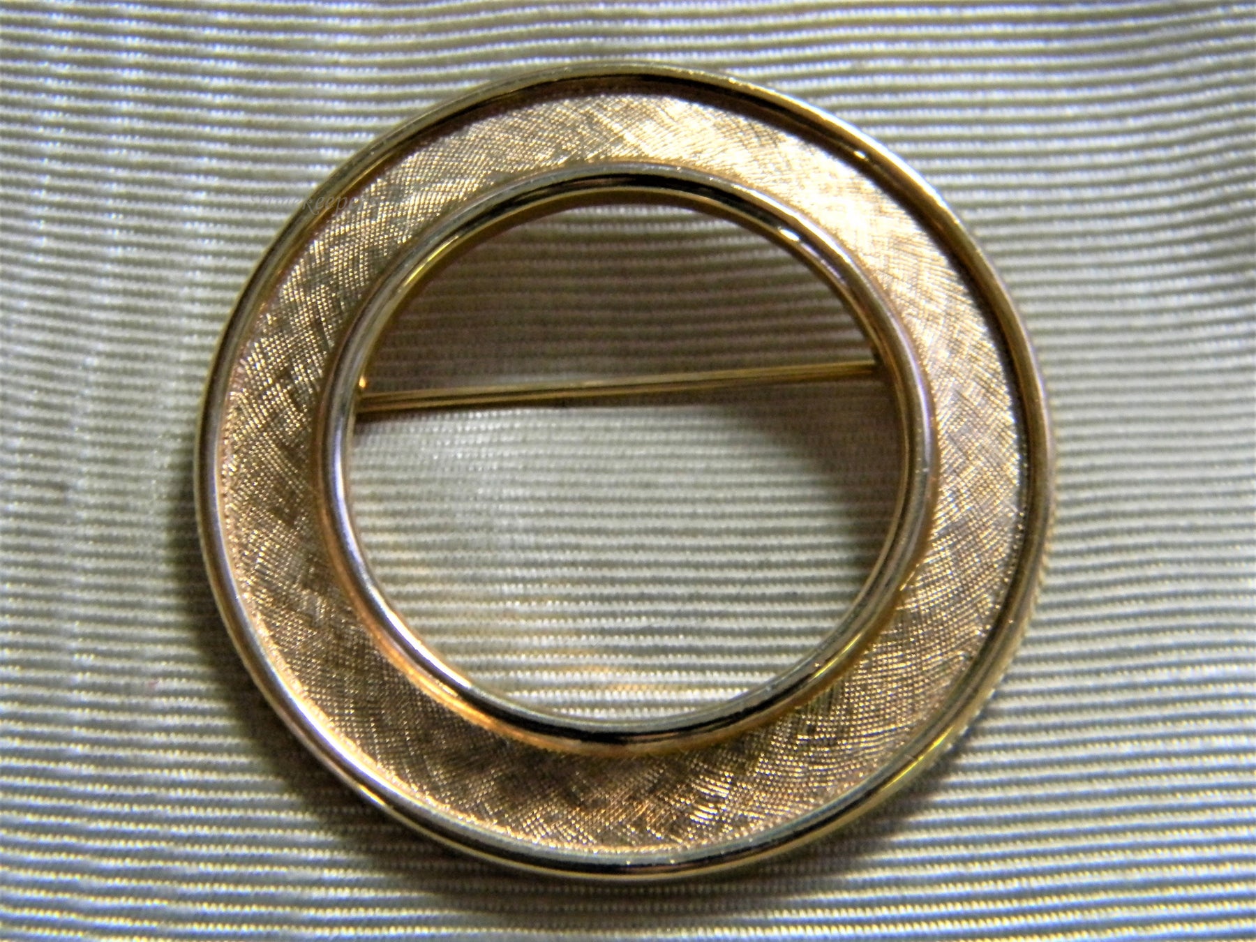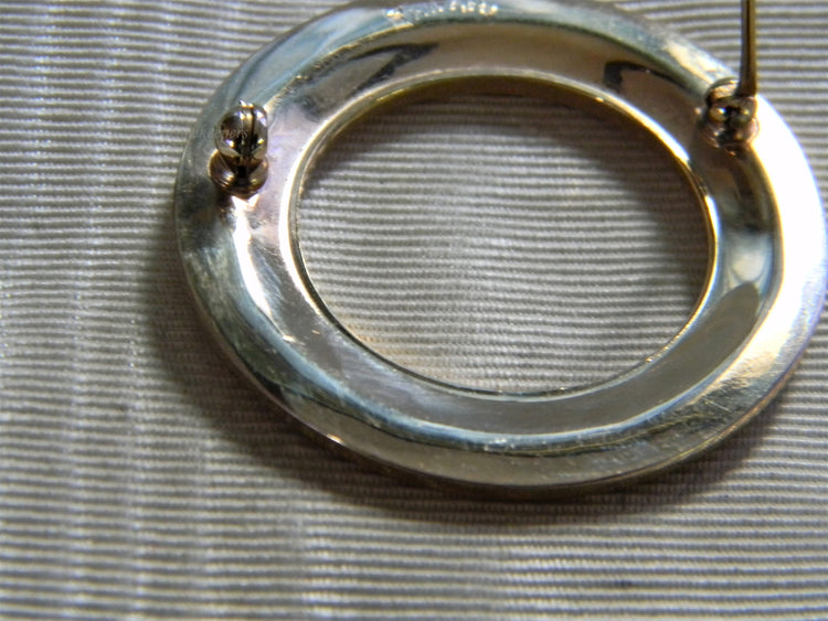 This brooch is marked Trifari on the back. It is a circle brooch with a cut out center in florentine finish. It is in good condition and very pretty. Everything works as it should.
