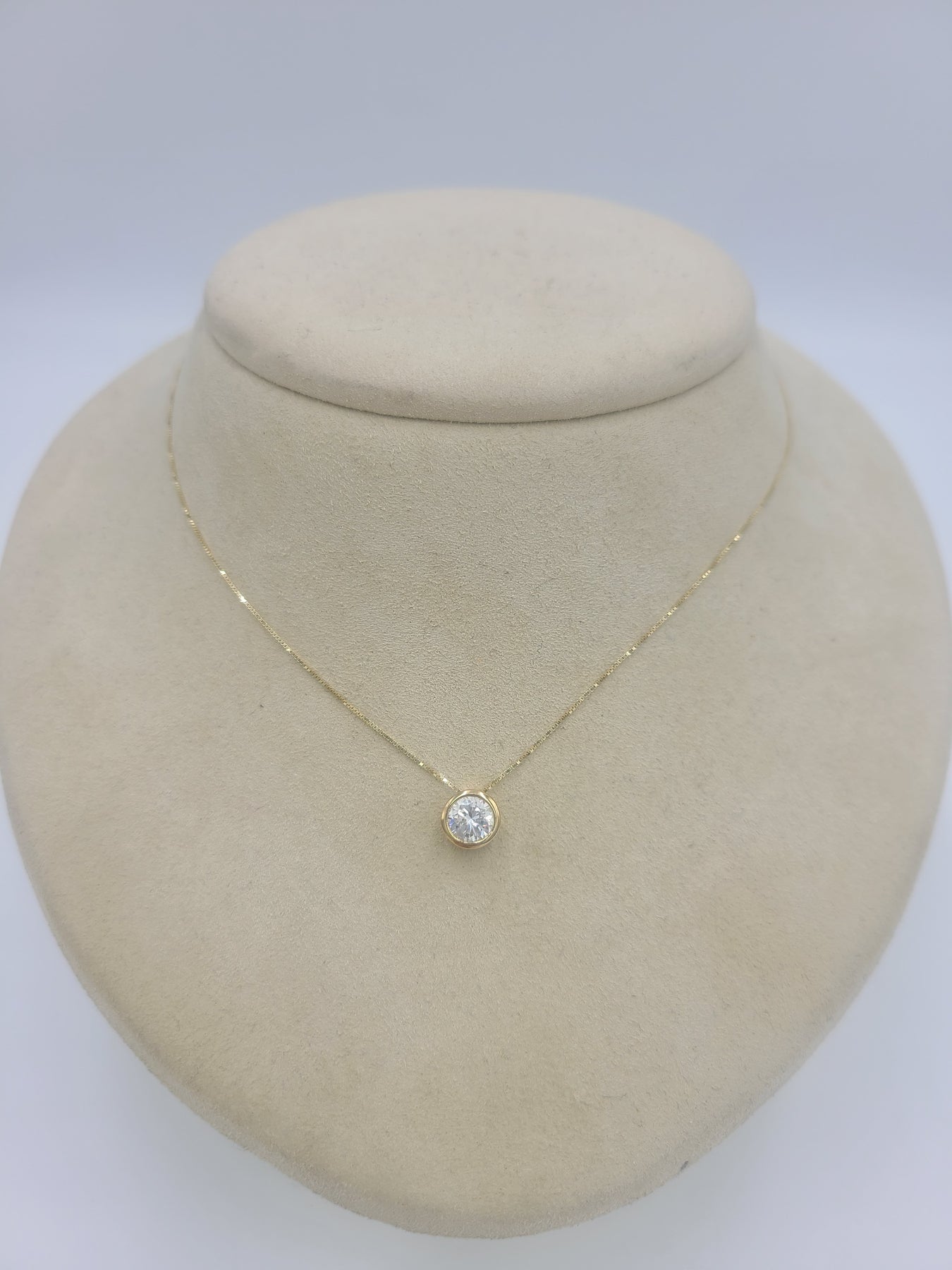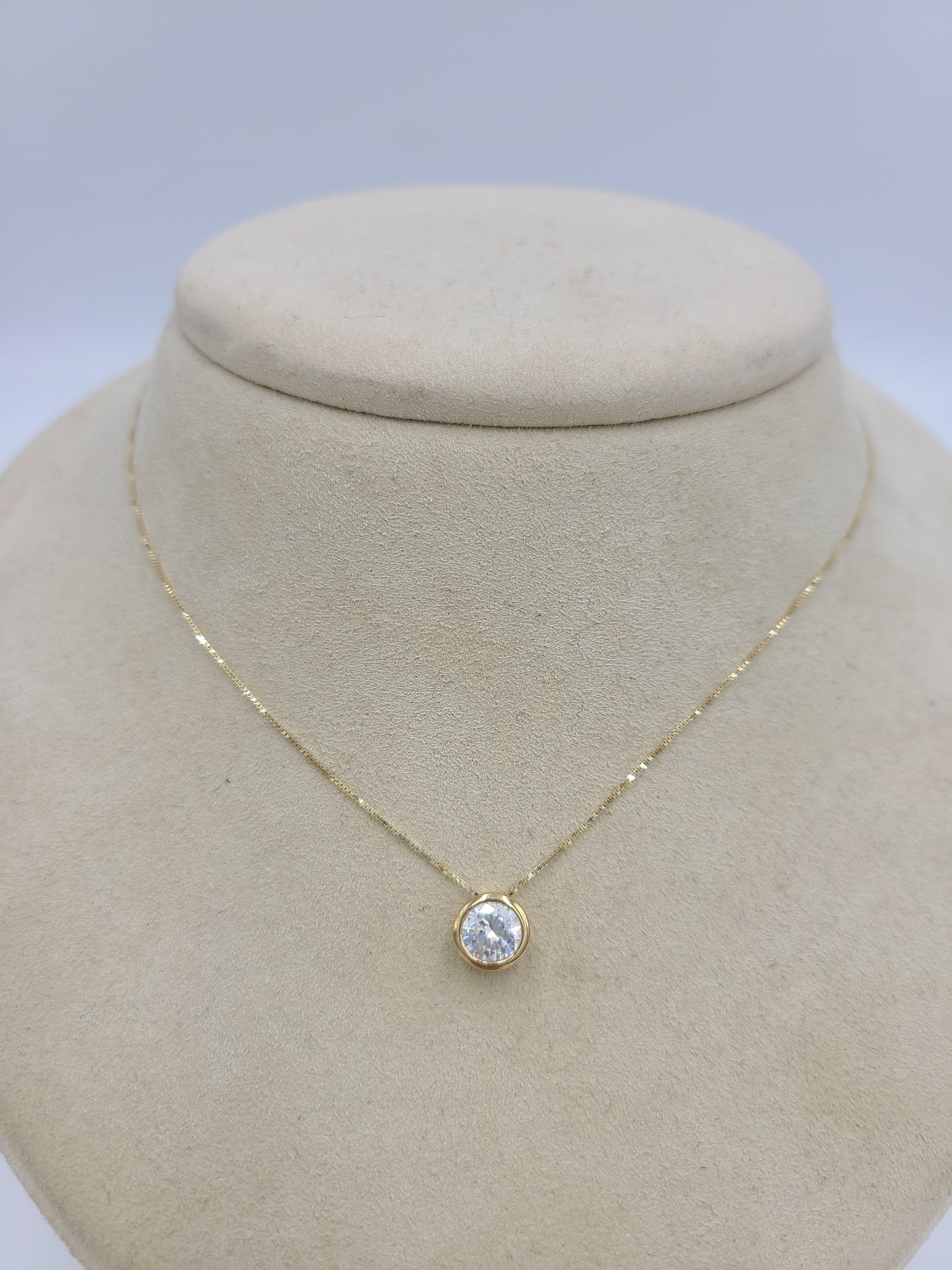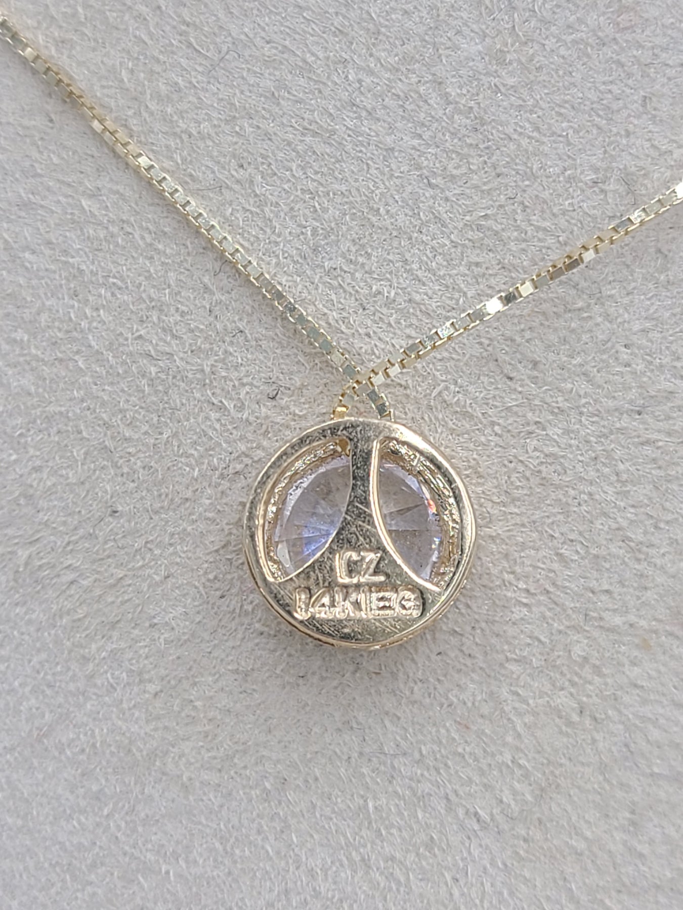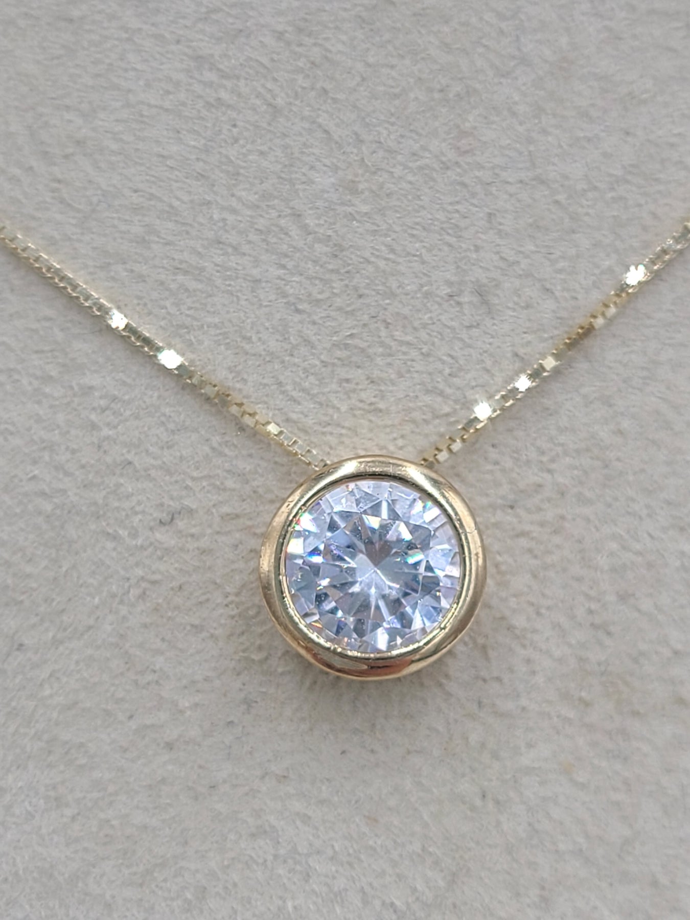 This is a pretty bezel set cubic zirconium stone set in 14kt yellow gold. Comes on an 18" box chain. Both pieces are stamped 14k. Would be a nice anniversary, birthday, Christmas, Mother's Day or Valentine's Day present for her.