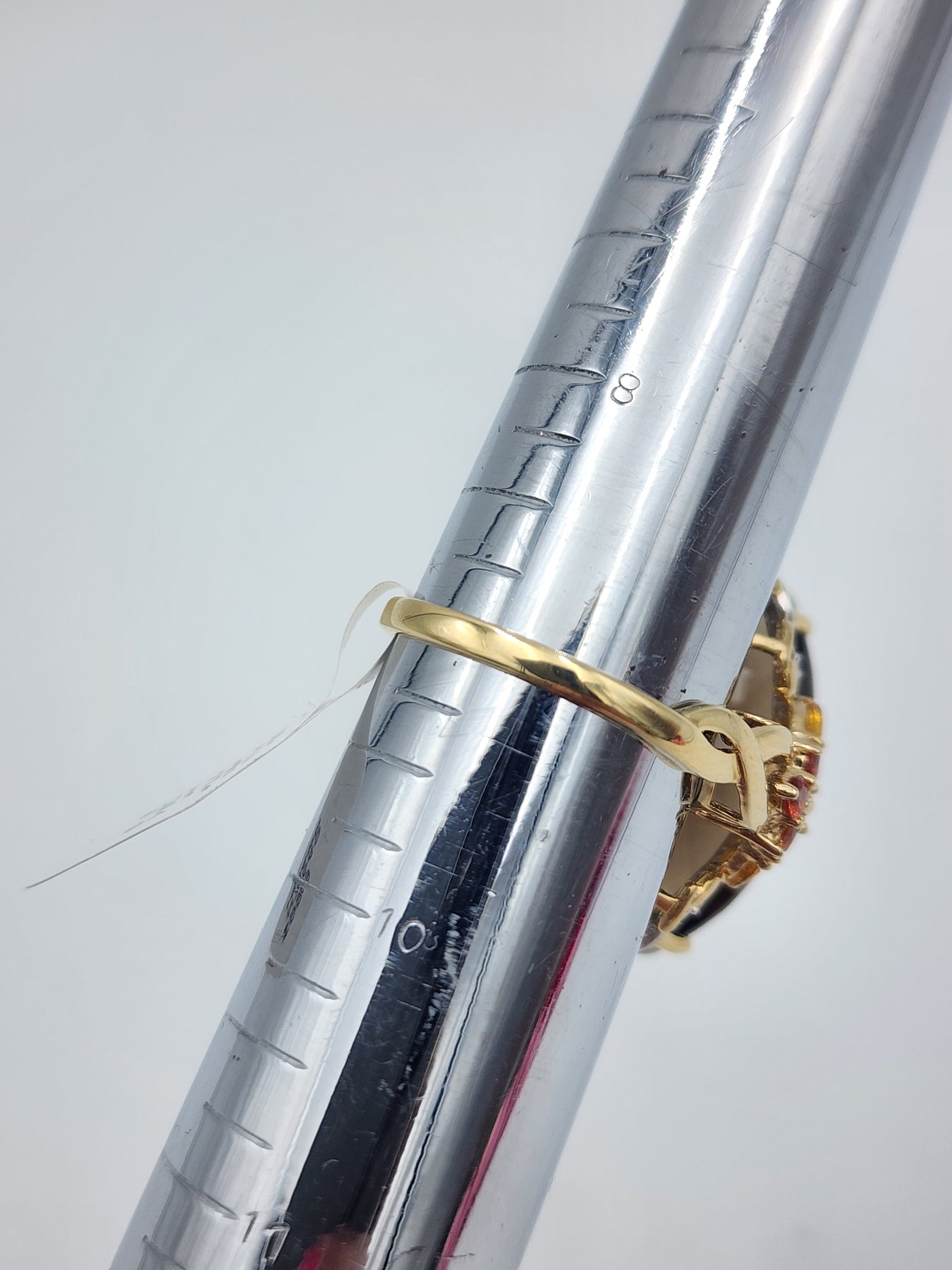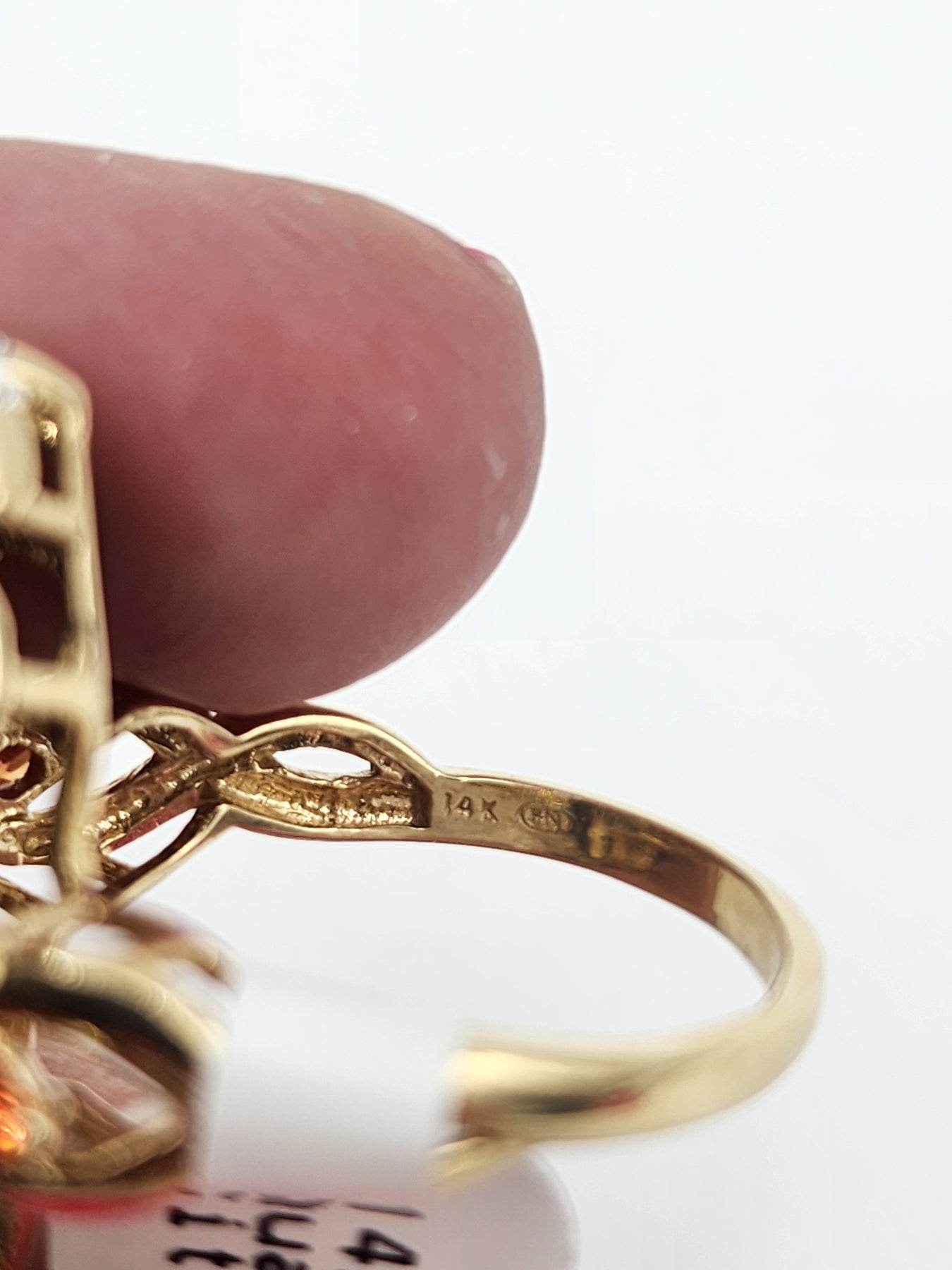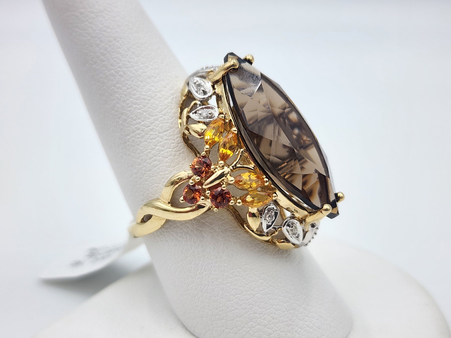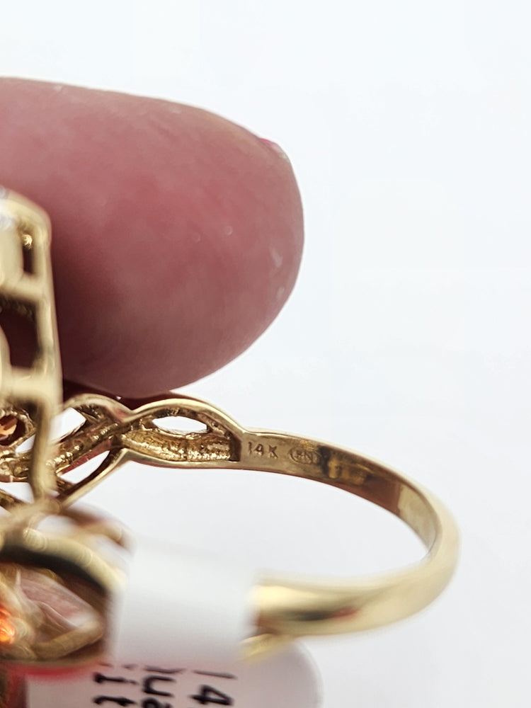 This is a lovely cluster of many different stones. It features a large marquise cut smoky topaz, along with yellow topaz marquise stones, round citrine gemstones and small round cut diamonds. Ring is stamped 14k and has been acid tested for gold purity. Would be a nice anniversary or birthday gift for her!