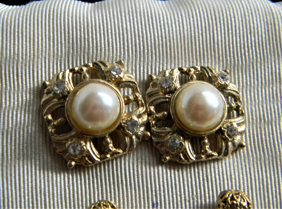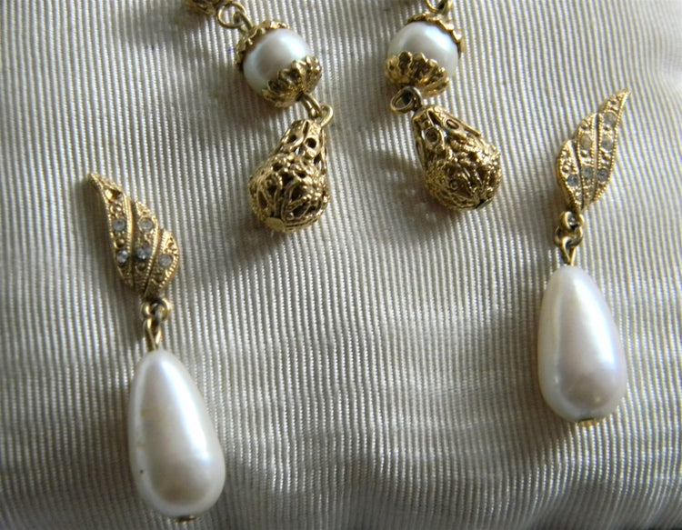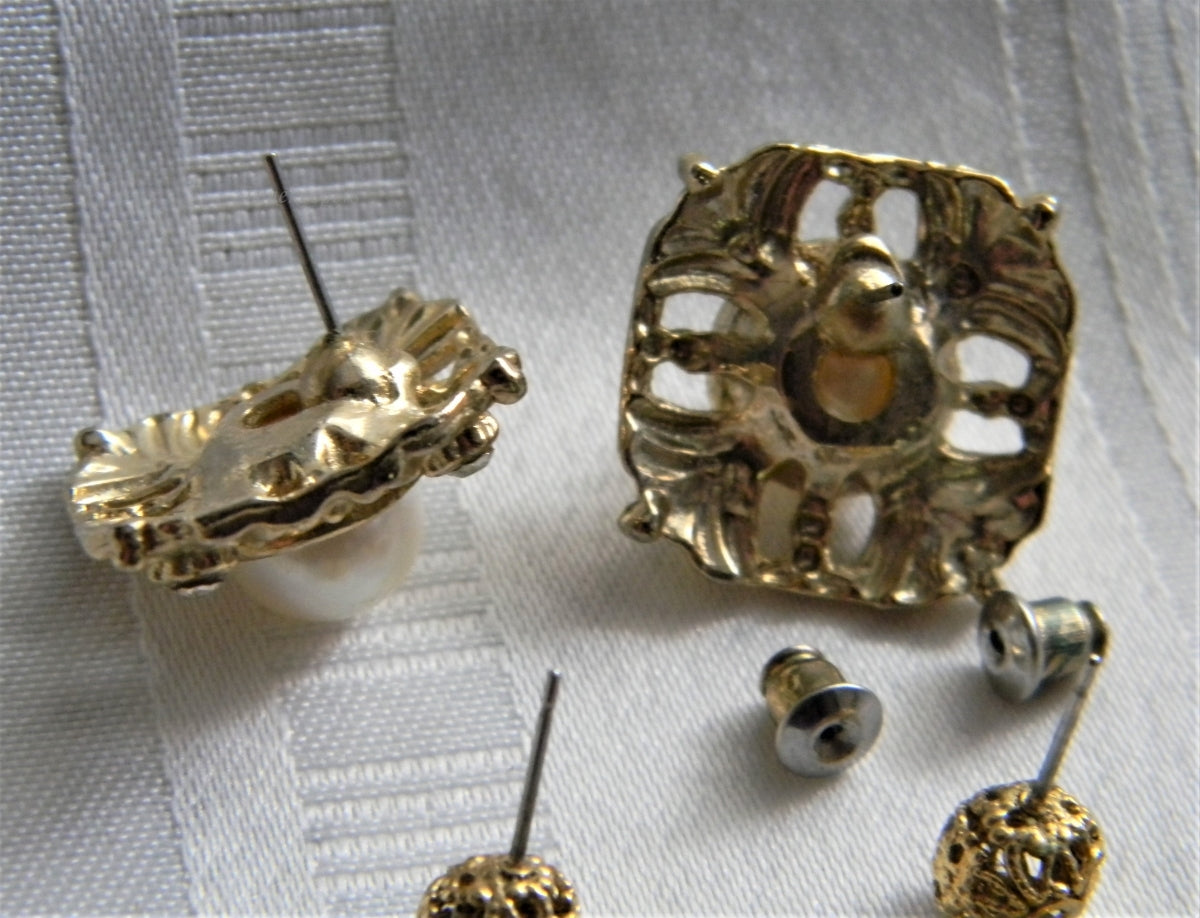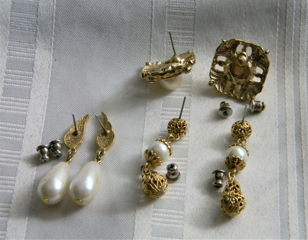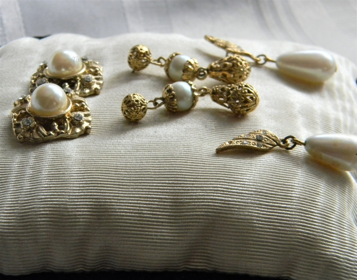 Offered here is three pair of imitation pearl earrings. One pair features a single pearl framed in gold tone filigree and clear rhinestones. The other two pair are dangle earrings. All three pairs are studs with push on backs. There are no markings on these earrings.