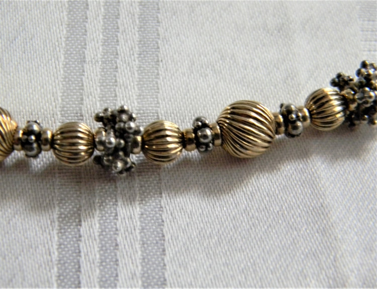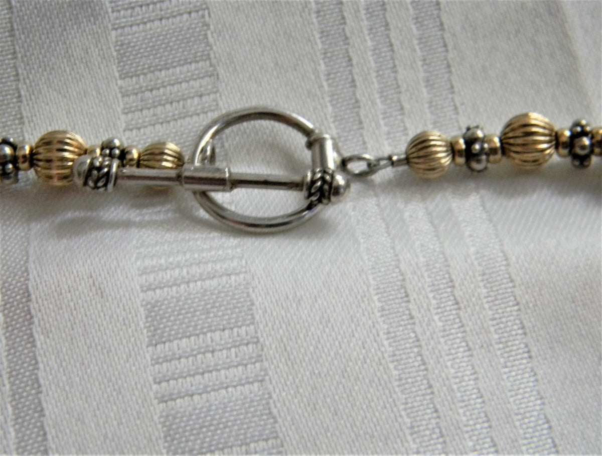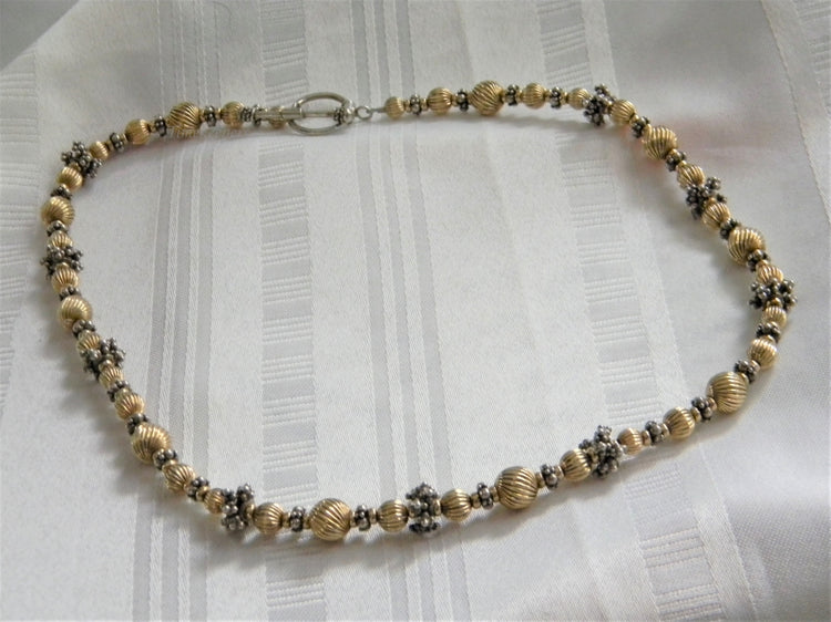 Stunning necklace featuring gold tone round beads with ridges with silver tone spacers. This necklace does feature a toggle clasp.