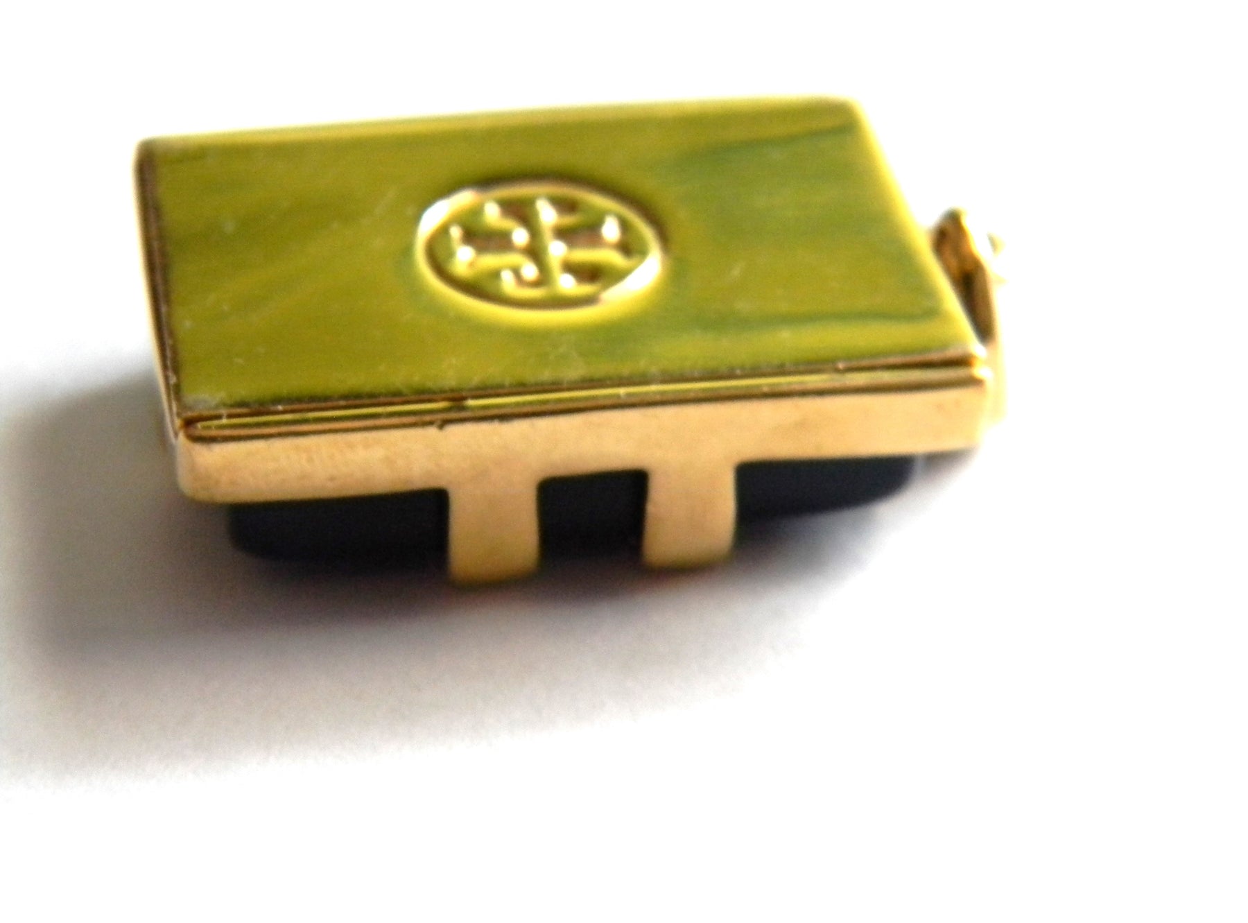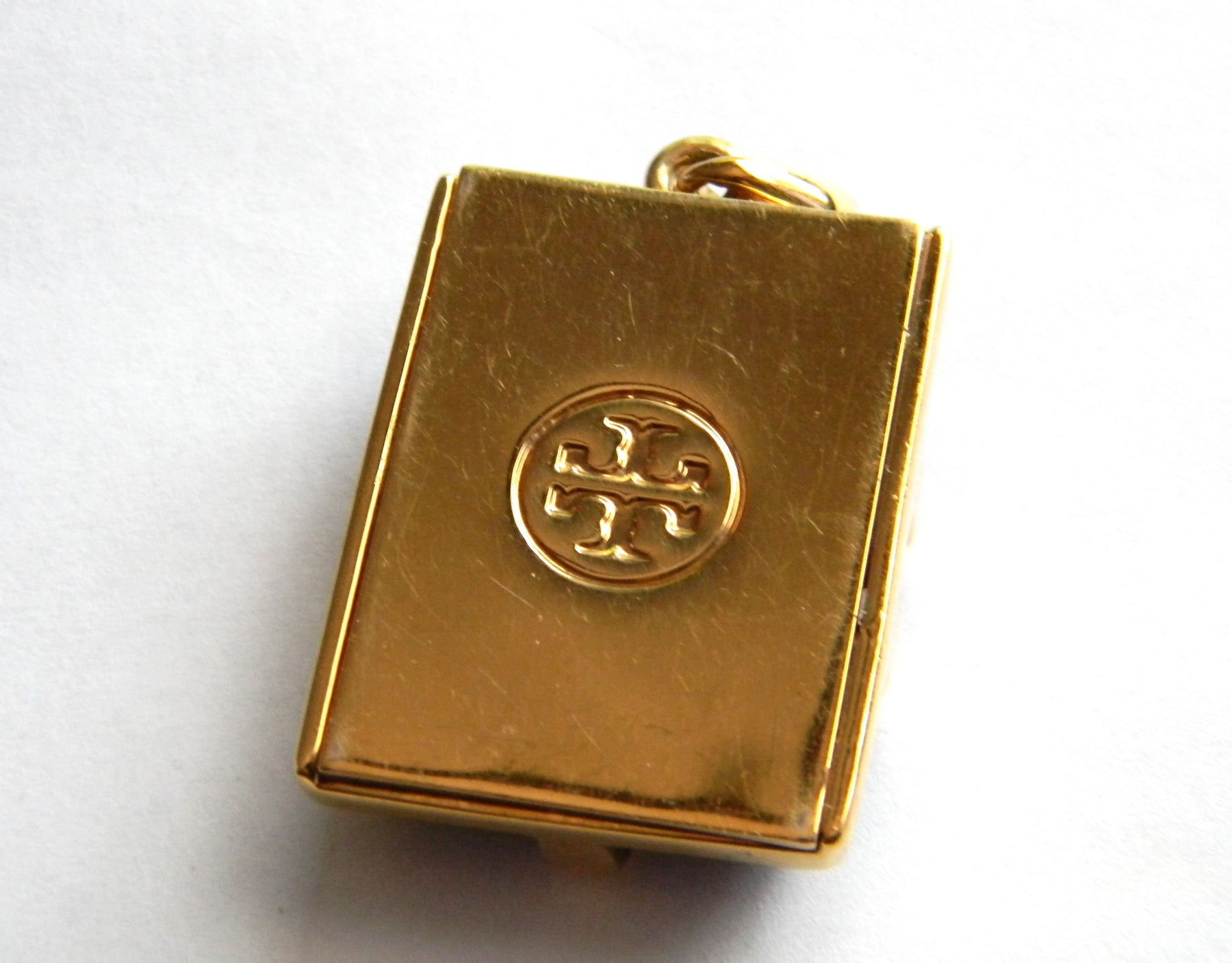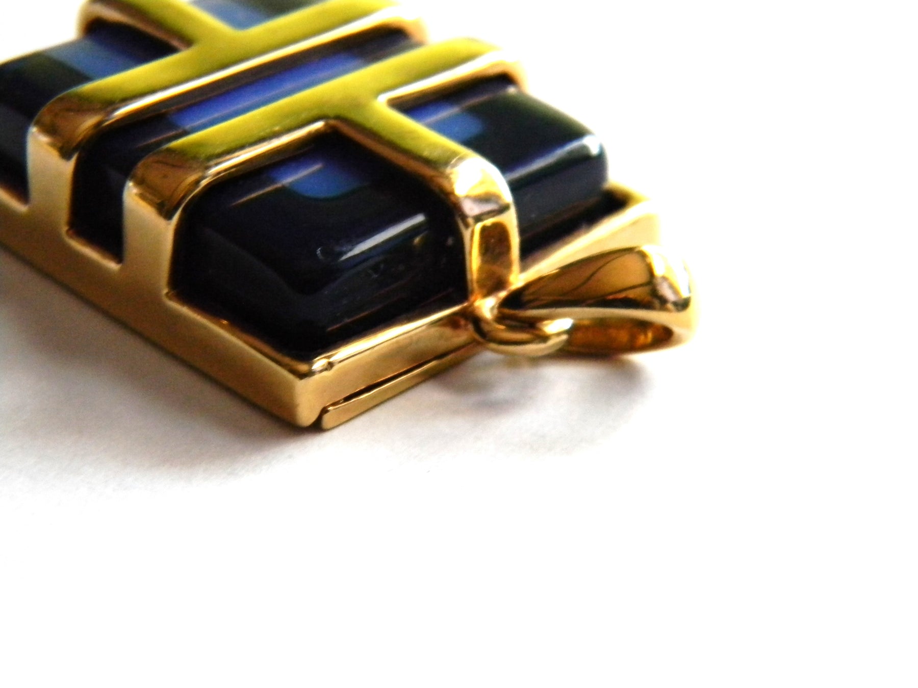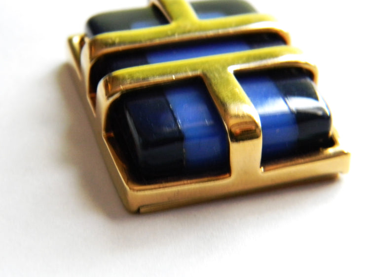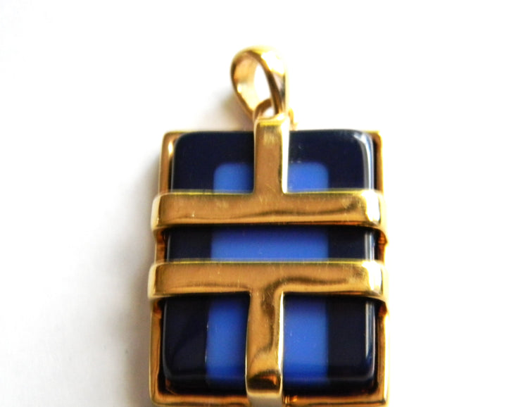This pretty two tone blue acrylic pendant is engulfed in a gold tone cage. The back is marked with a 'T' or a cross in a circle.